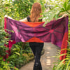This wrap is fully reversible and is created with modified Fusion Knitting. Each flower is worked from the centre out and grafted to an adjacent flower on a common edge. Small triangles complete the sides between the flowers. Each flower uses two colours of fingering weight yarn; each colour will form a flower on one side of the fabric.