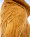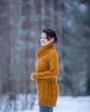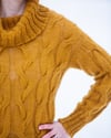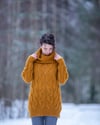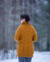 The sample modeled is in Size S-M, worn on 34” bust, with approx 9”/22 cm positive ease. Note that the big cables will pull back as ribbing even after wet-blocking which gives more fitted look even there is a large amount of positive ease in the measurements.