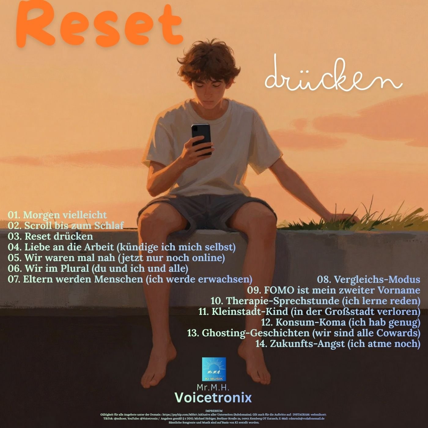 Stell dir vor: Du kommst erschöpft nach Hause. Legst die Vinyl auf. Track 1 beginnt - „Morgen vielleicht". Du hörst deine Gedanken, aber gesungen, verstärkt, verstanden. Bei Track 3 („Reset drücken") nickst du zum ersten Mal. Bei Track 7 („Eltern werden Menschen") ruft deine Mutter an, und du nimmst ab. Bei Track 14 („Zukunfts-Angst") atmest du tief ein und aus. Das Album endet nicht mit einem Punkt, sondern mit einem Atemzug.