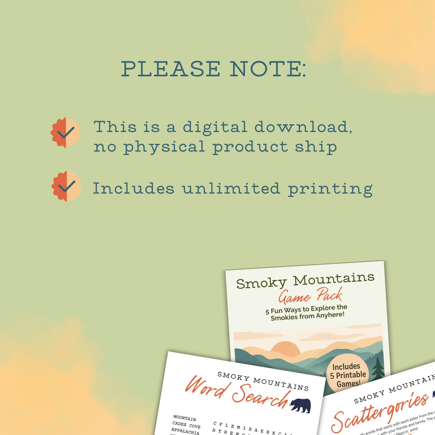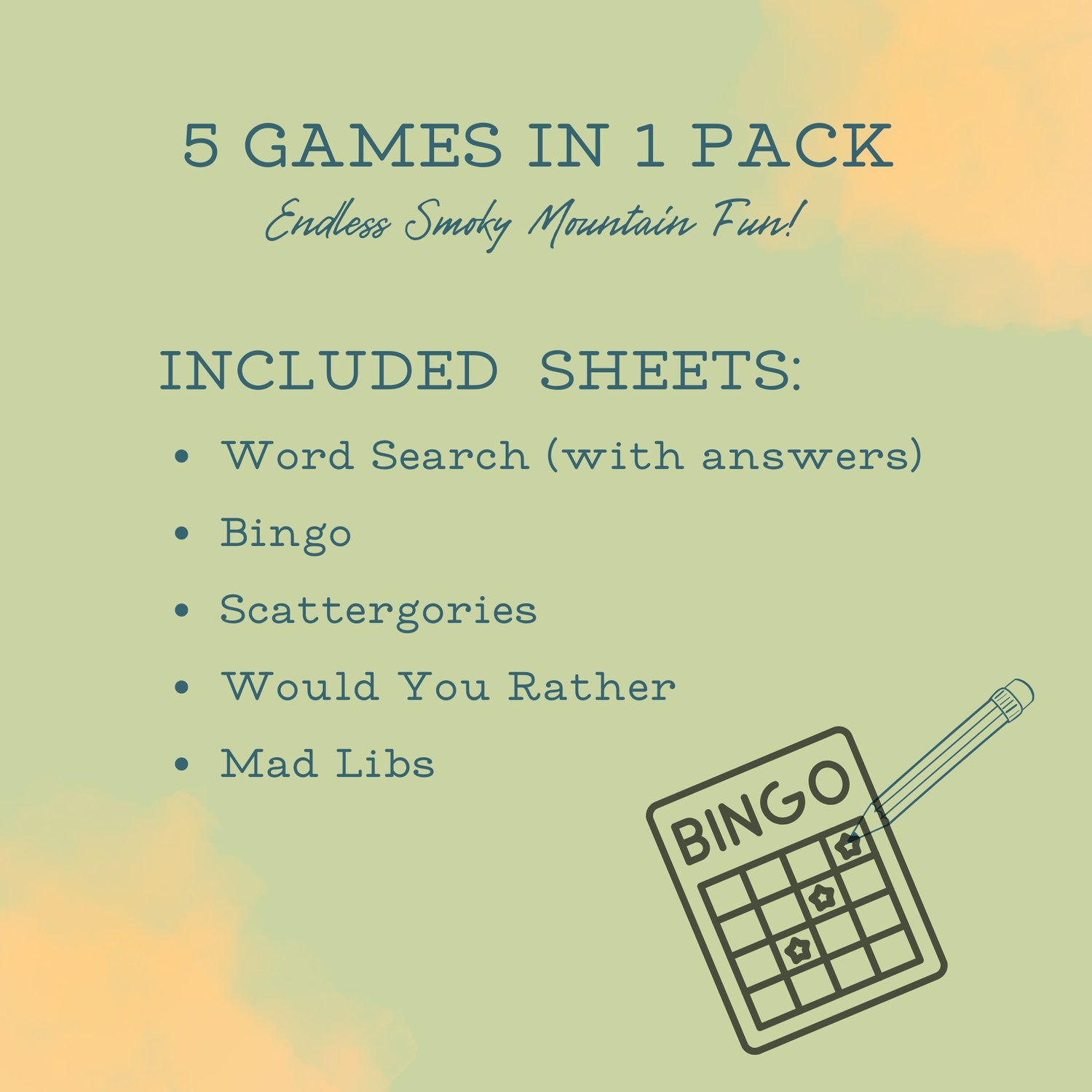 The pack includes a Word Search, Bingo, Scattergories, Would You Rather, and a hilarious Mad Libs adventureβall themed around the sights, sounds, and spirit of the Smokies.