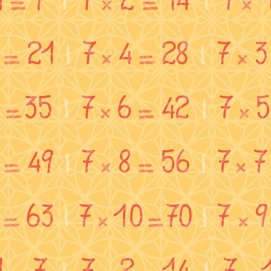 Seven times table seamless background pattern. Hand written math multiplication vector illustration.
