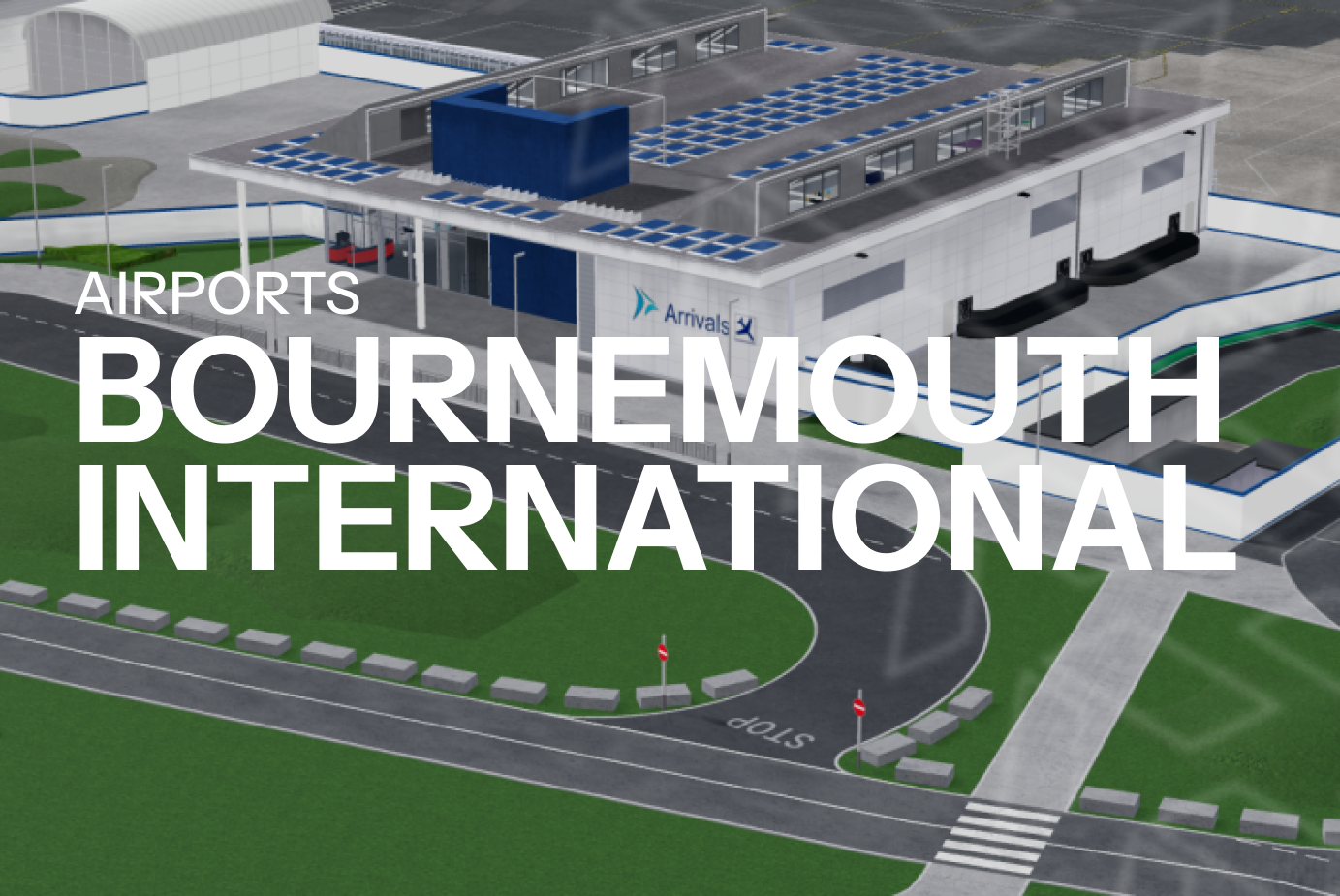 Bournemouth Airport is an international airport located 3.5 NM north-northeast of Bournemouth, in southern England. The site opened as RAF Hurn in 1941, but was transferred to civil control in 1944. Features 1:1 size, detailed taxiways & runway, high quality exterior, furnished and detailed arrival area/building