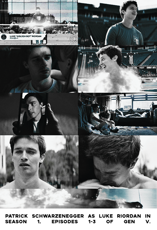 1771 screencaps of patrick schwarzenegger as luke riordan in gen v, season 1 episodes 1-3. some scenes with his other costars will be featured if luke is present. i am not affiliated with gen v or patrick schwarzenegger. triggering content including fire, nudity, and emotional distress will be present. enjoy!