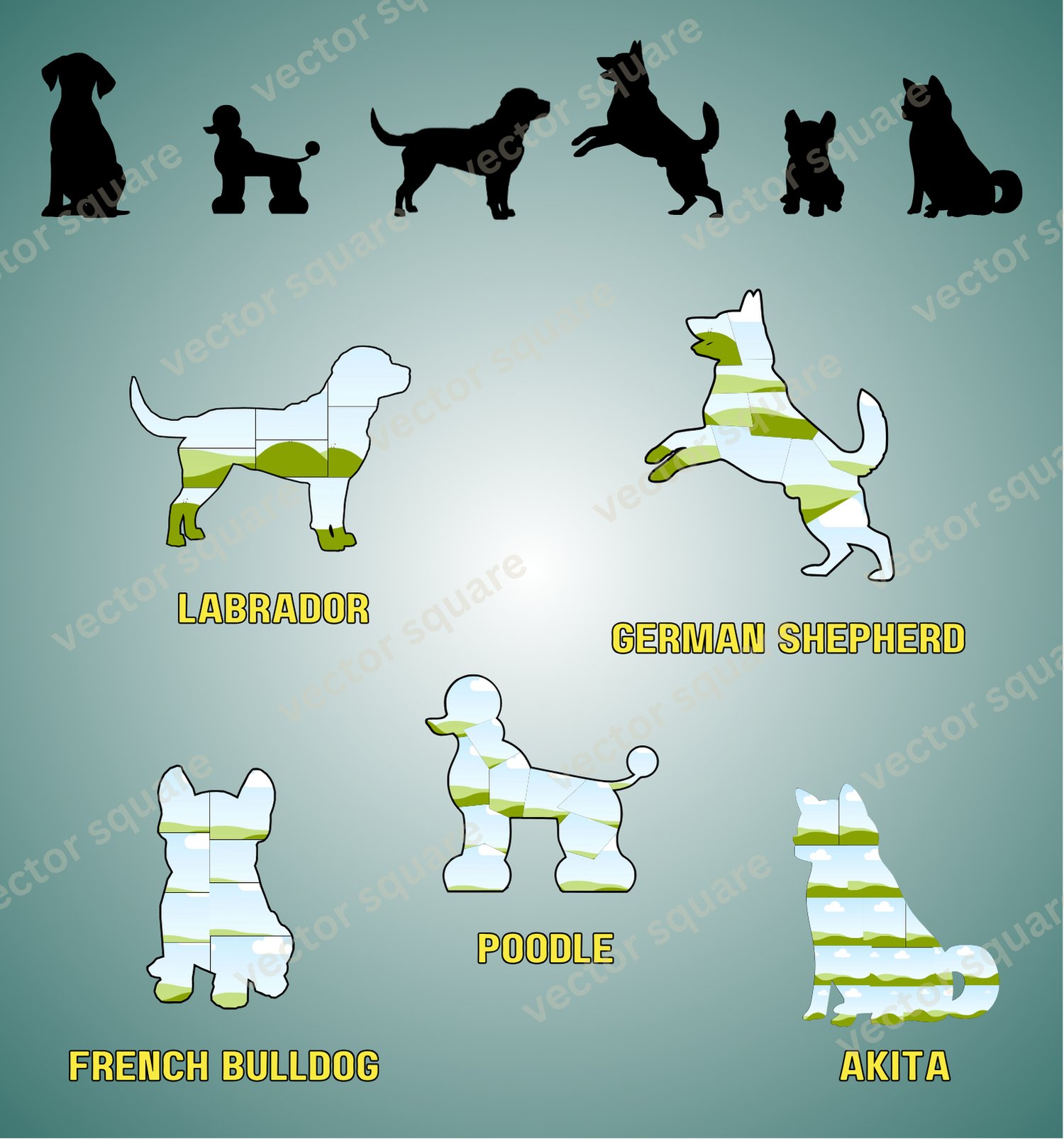You will get your own copy of Canva Template with 3 pages containing 6 different dog breed photo collages: Golden Retriever, French Bulldog, Labrador, German Shepherd, Poodle and Akita. Golden Retriever collage comes in 2 versions, with and without outset. All collages have separate outline object which is color editable.