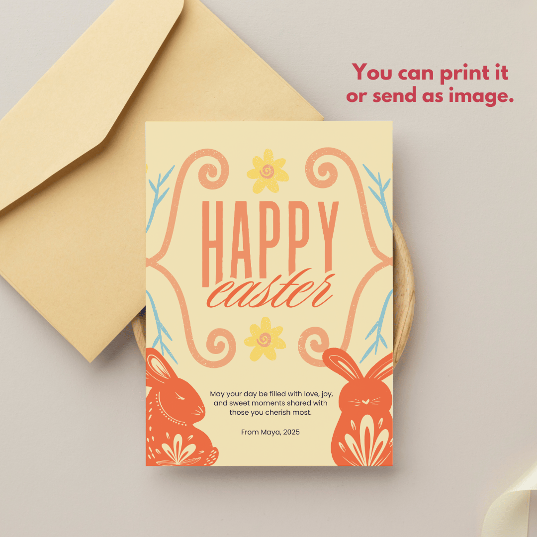 Perfect for Easter egg hunts, this vibrant and cheerful design features cartoon Easter bunnies, decorated and painted eggs, and bright spring colors that symbolize rebirth and togetherness. Customize the text to add your personal message and share it with family and friends. This printable and editable template is perfect for invitations, messages, or festive decorations. Download today and make this Easter memorable!