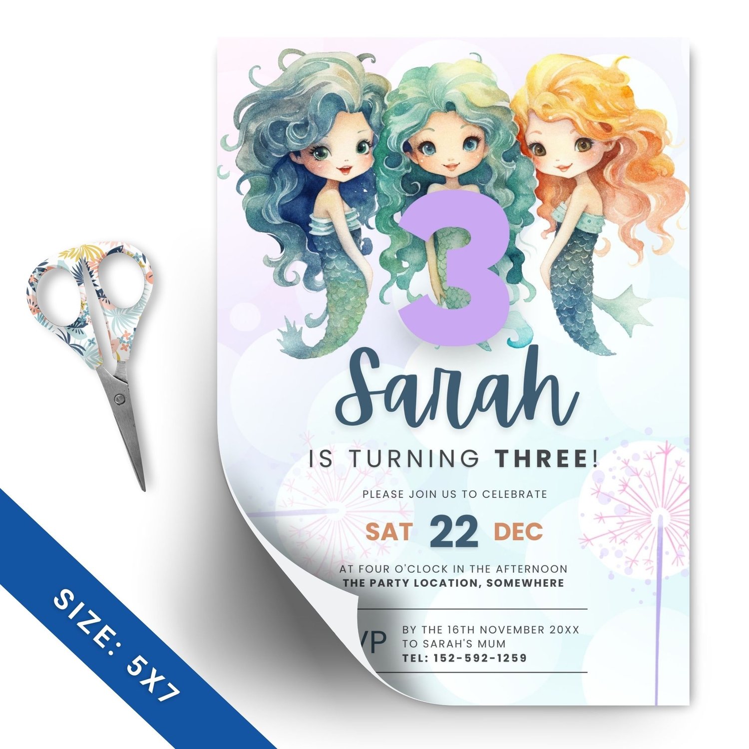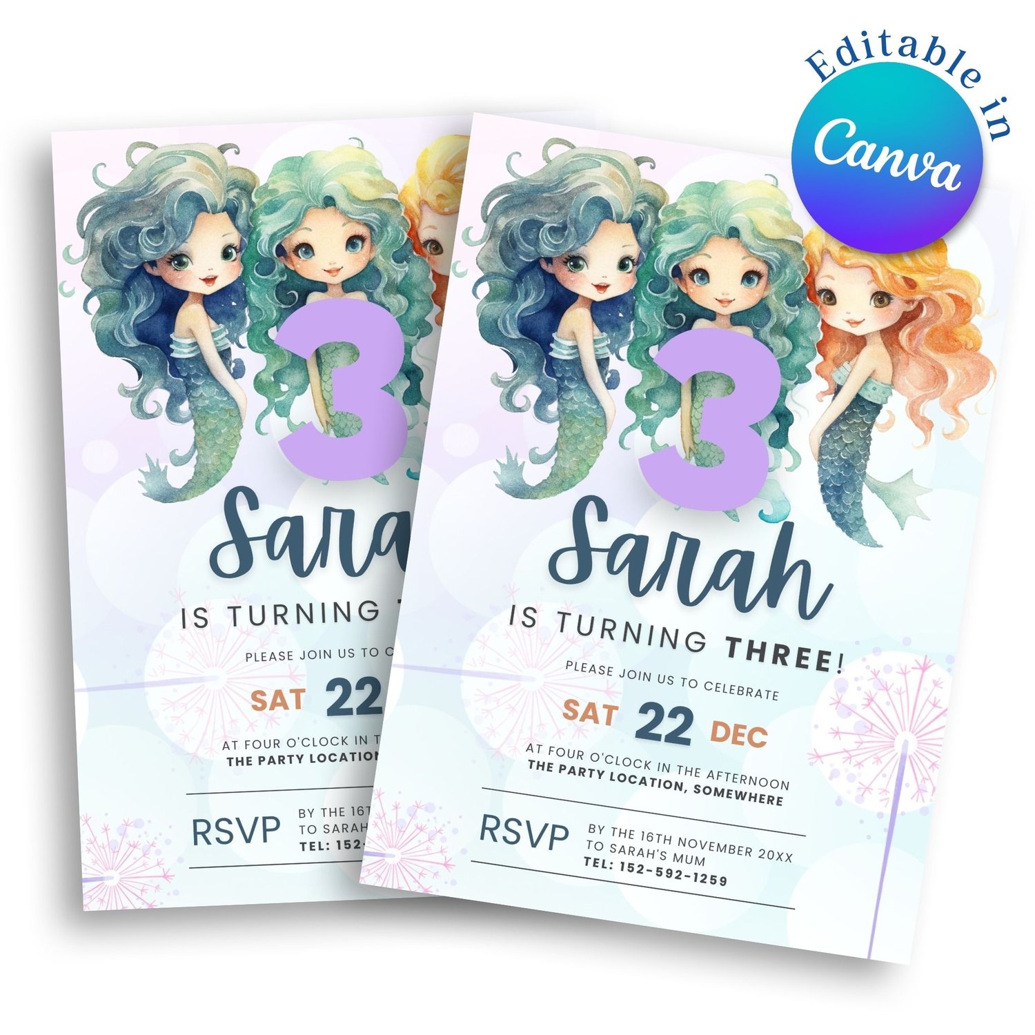Canva Mermaid Theme 3rd Birthday Party Invitation - Digital Download PDF