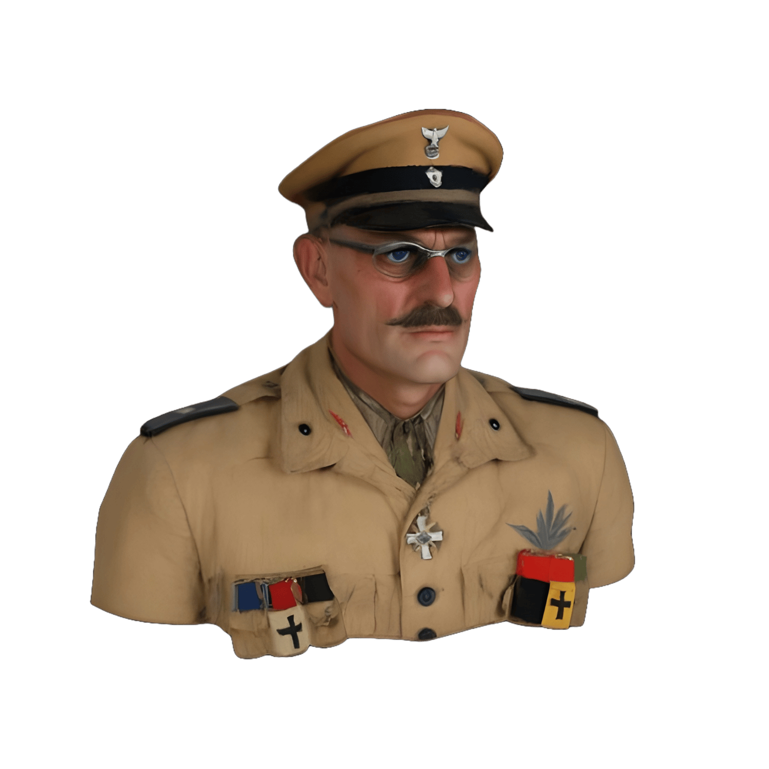- A military officer figure in a tan uniform with medals and insignias