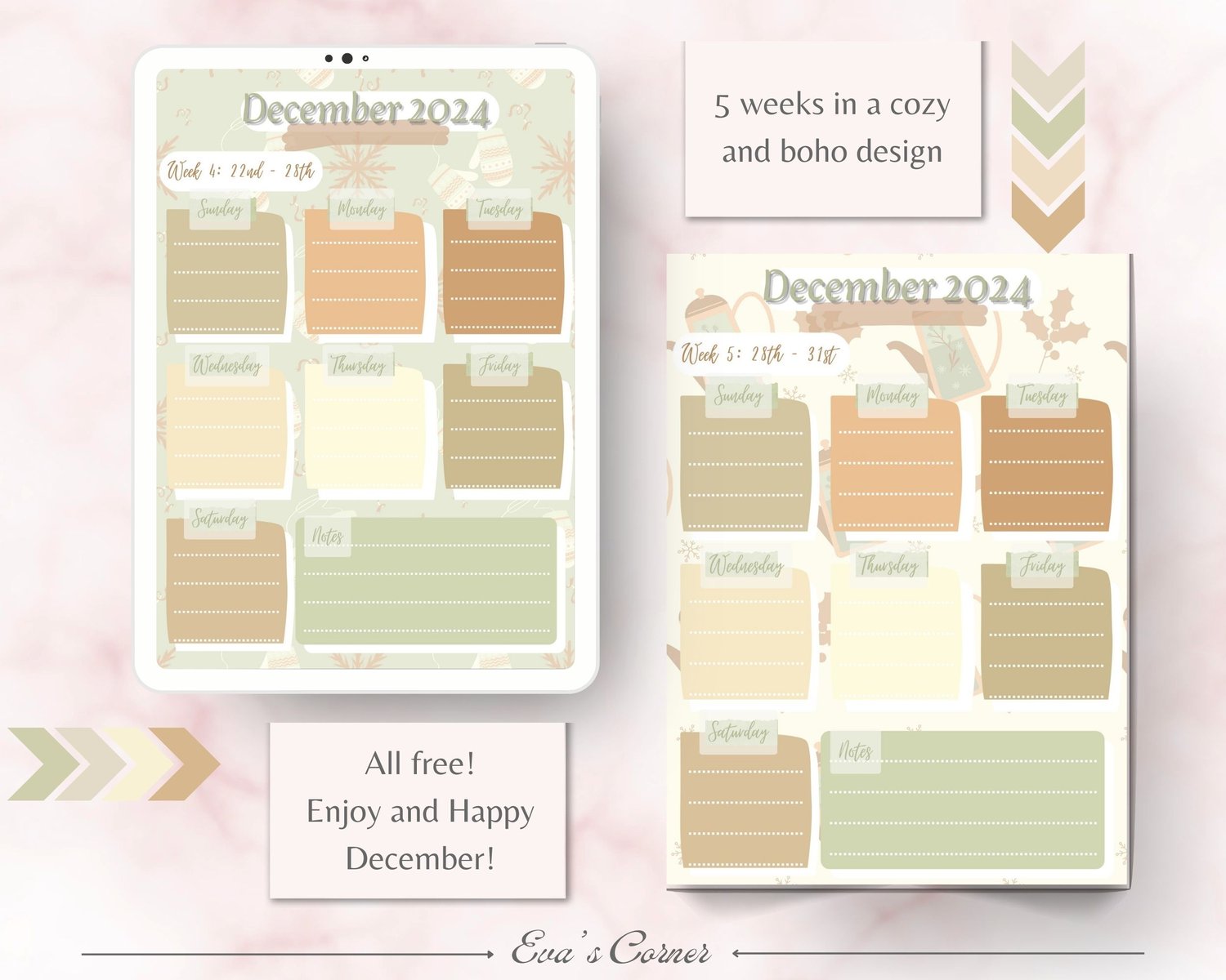 Free Printable - December 24 Weekly | Sunday Start | Cozy & Boho Themed | A4 Size