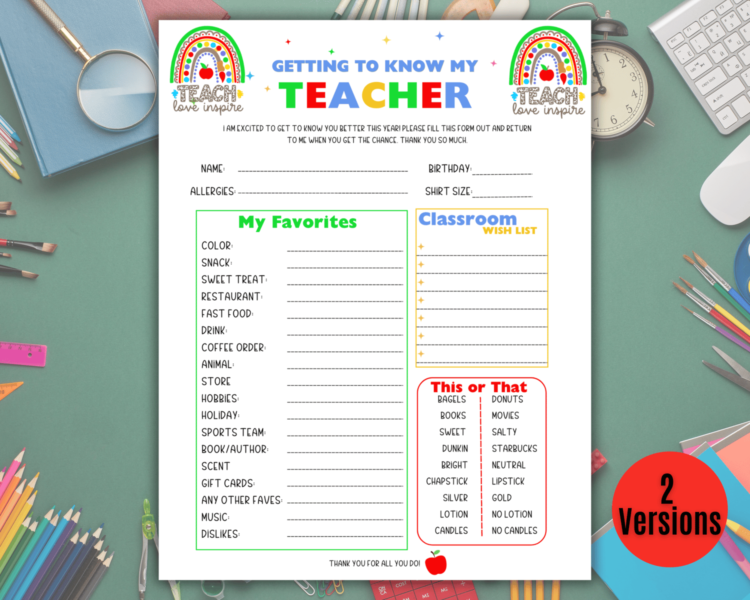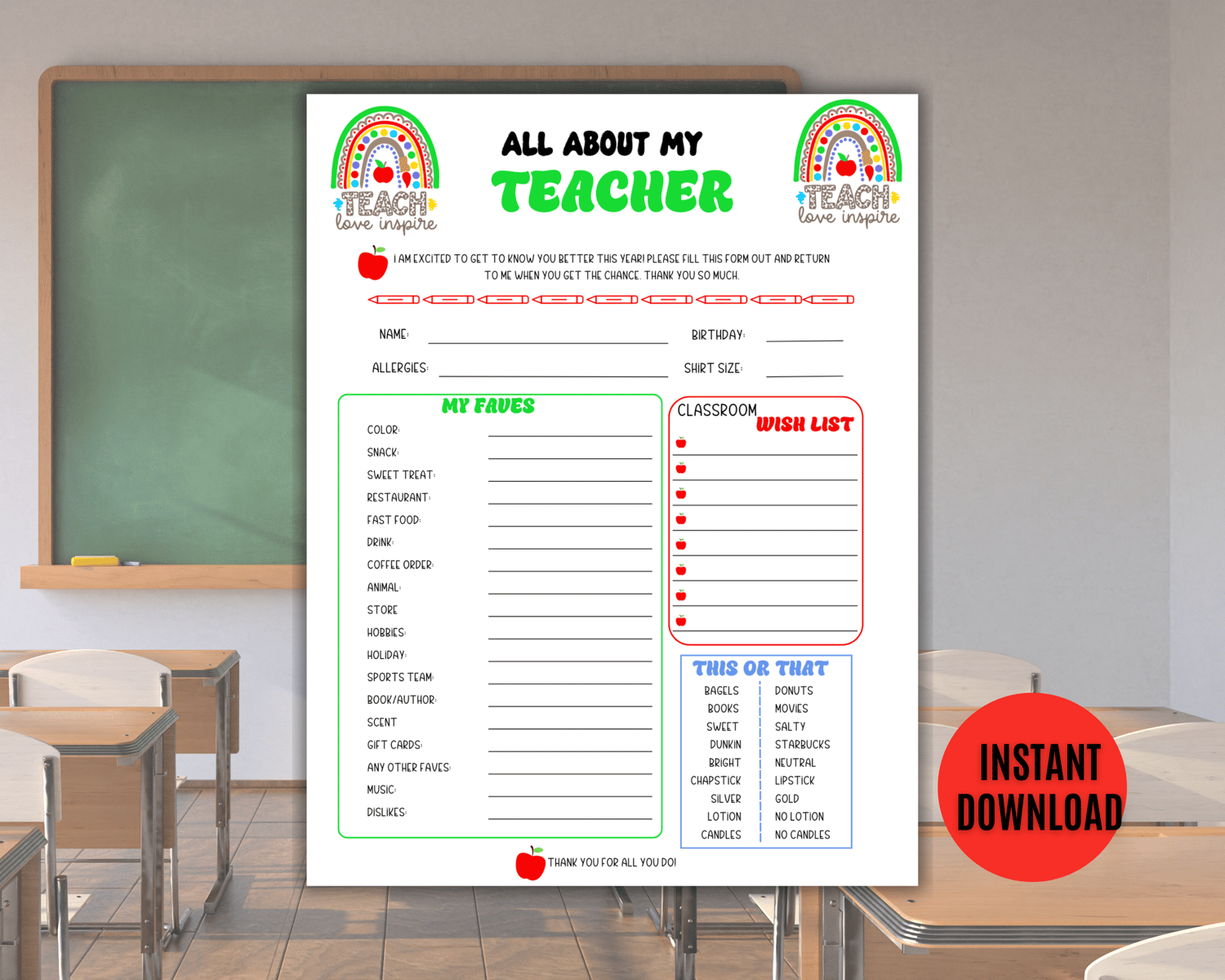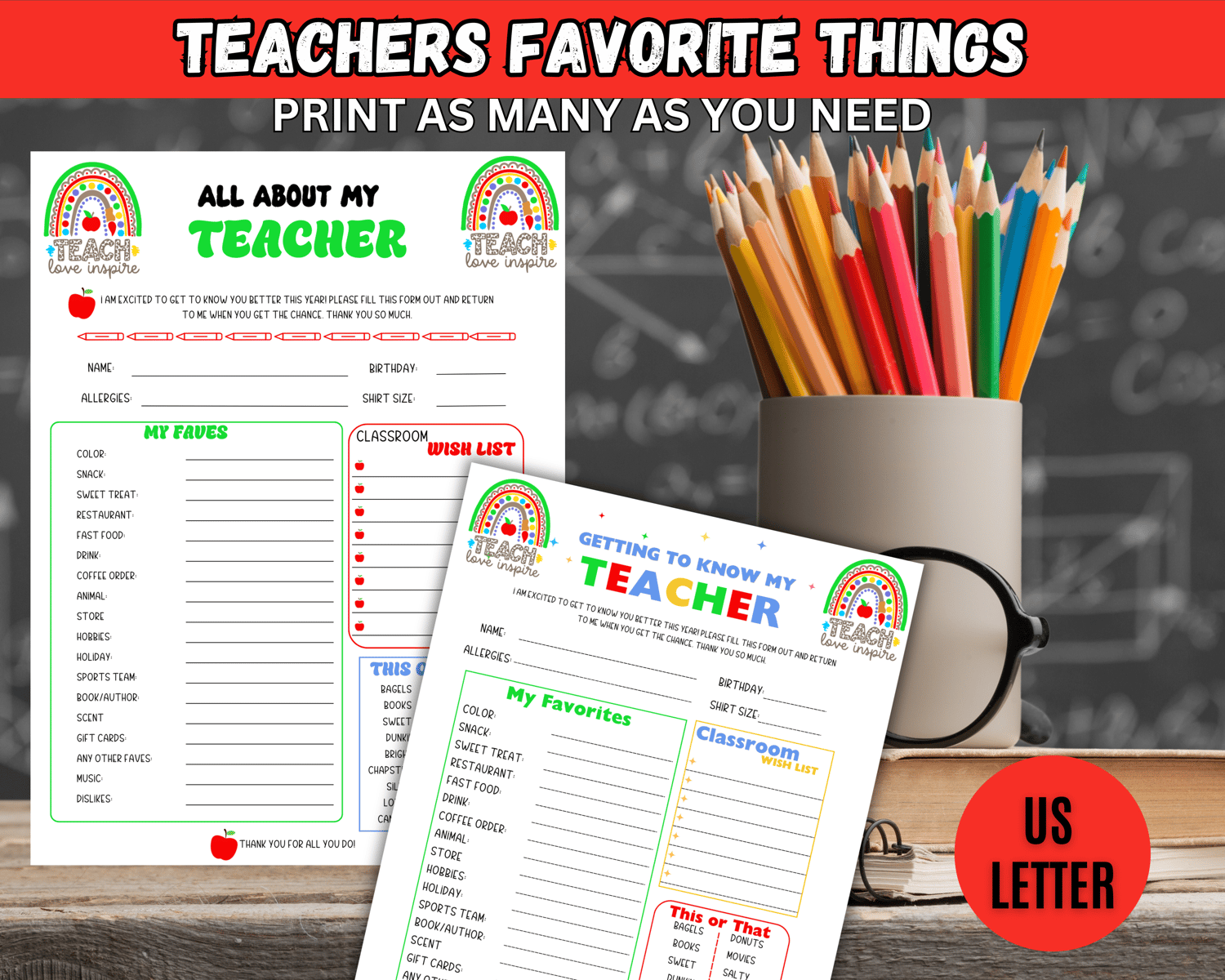 This printable questionnaire with 2 versions, available in US Letter size, helps gather the teacher's favorite things and classroom wishlist. Perfect for choosing the ideal back-to-school gifts and making thoughtful, personalized selections.