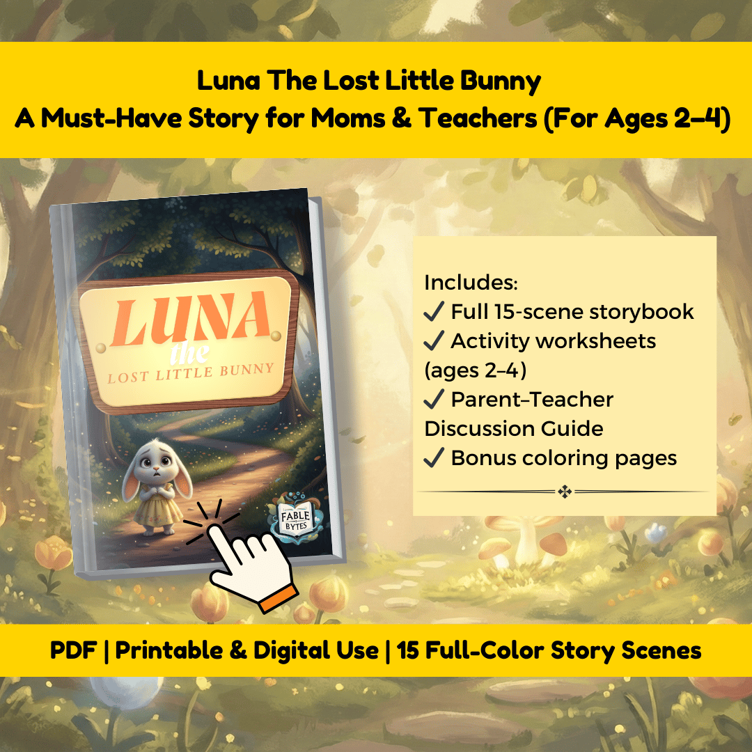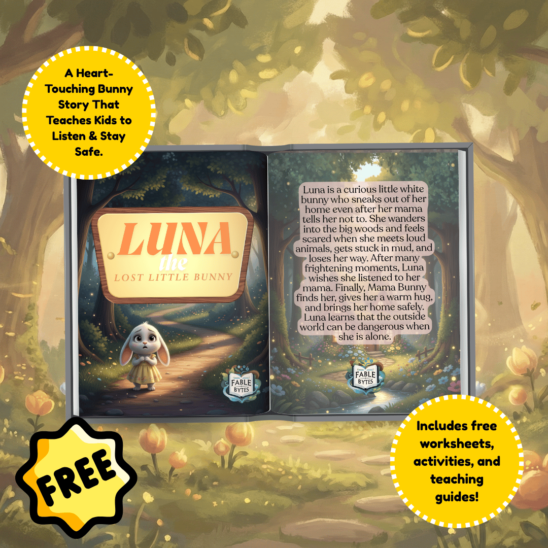 This 15-scene storybook follows Luna, a curious white bunny who learns a BIG lesson after getting lost in the woods.