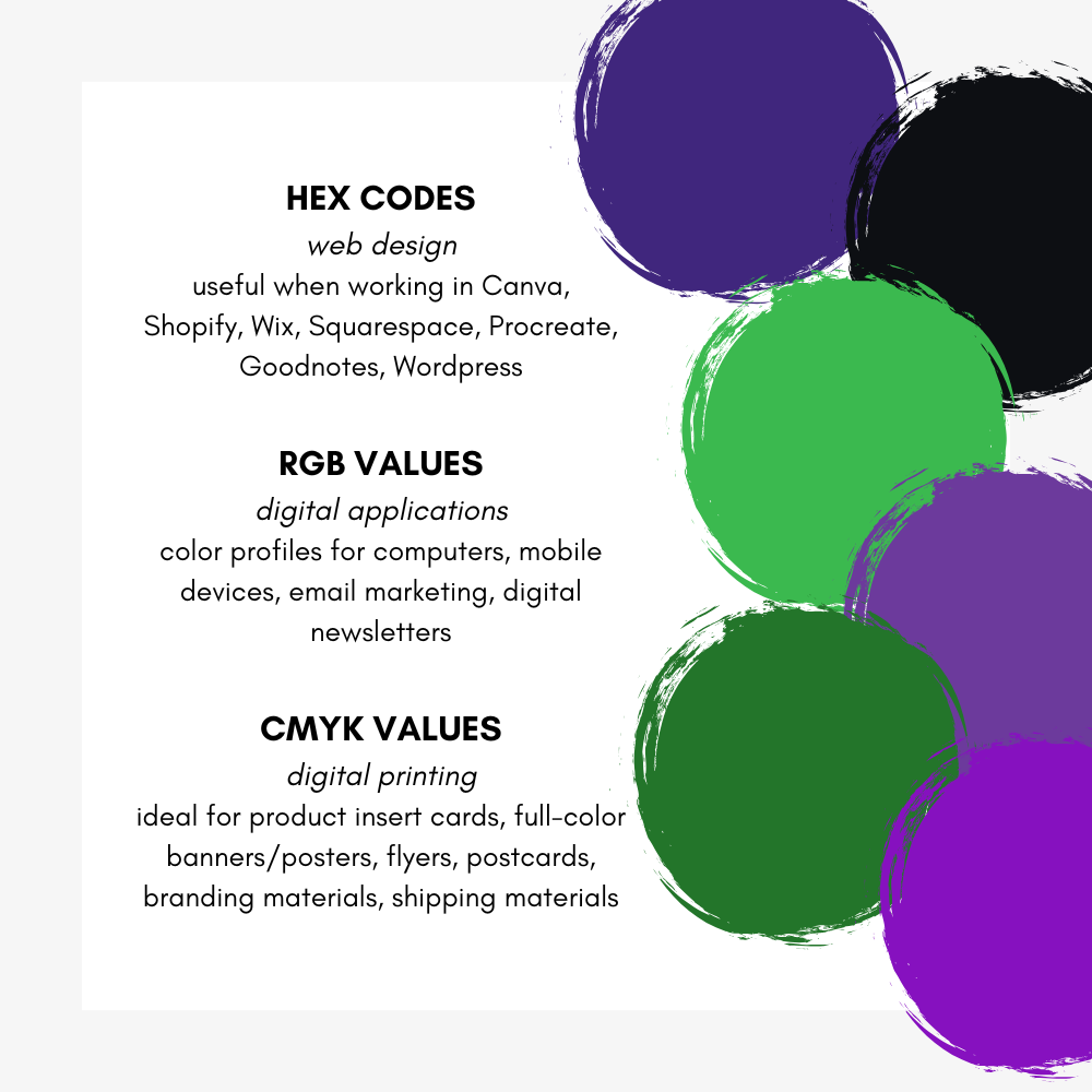 + Detailed Hex Codes, RGB, and CMYK values for each color