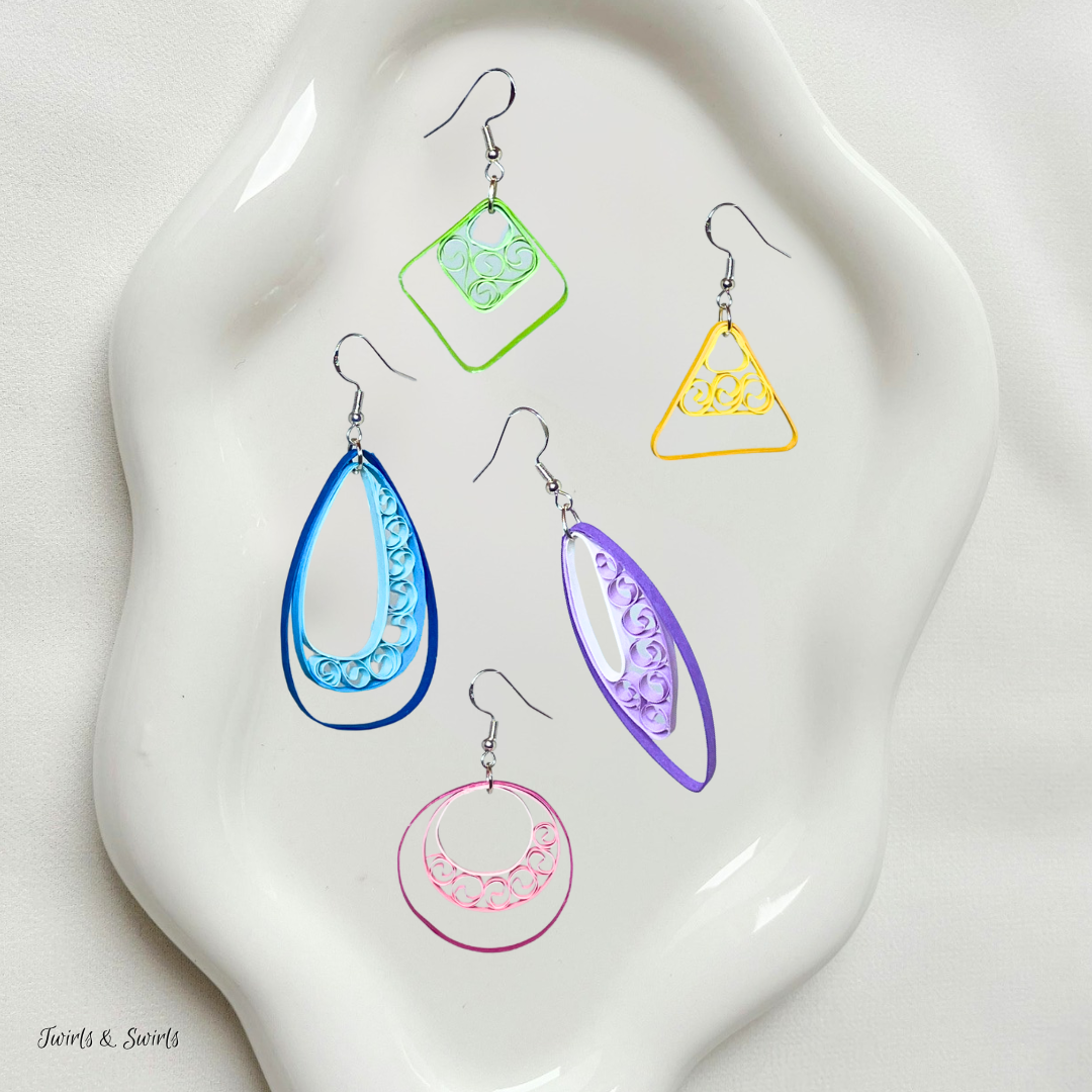 At the center of the design, intricate paper quilling swirls are carefully shaped by hand, adding soft texture and detail that beautifully contrast the clean geometric lines of the outer layers. The layered triangle silhouette gives these earrings a modern edge while still feeling timeless and elegant.