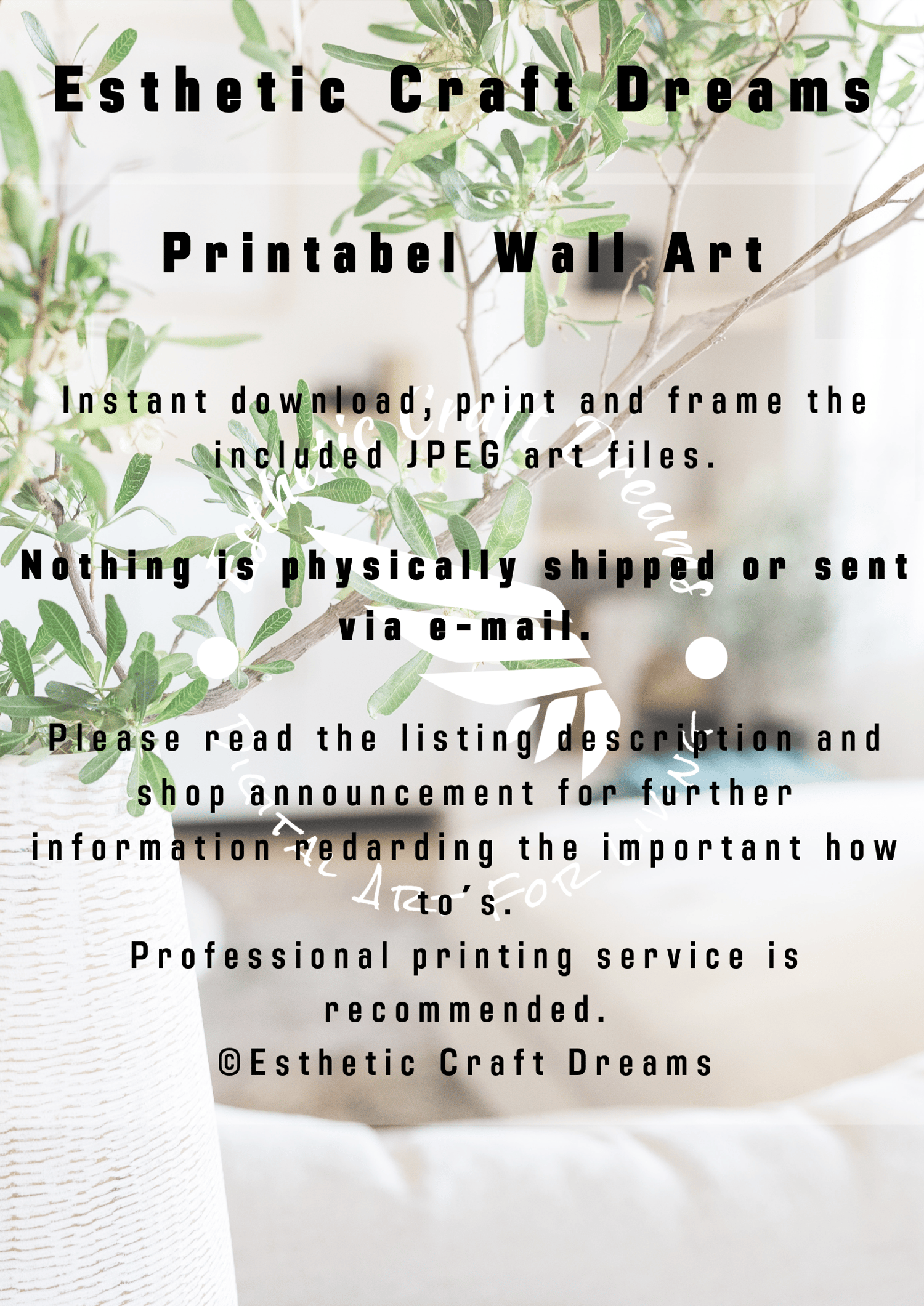 Simply download the JPEG files and choose the appropriate file size for your printing needs. For best results, we recommend printing on matte or satin heavy paper with a high-quality printer. With this digital download option, you can print and frame the artwork exactly as you want for a truly custom piece of decor.