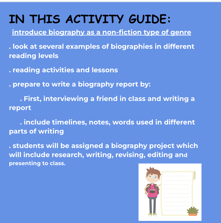 Next, the guide provides opportunities for students to practice writing their own biographical texts, starting with short biographical sketches and progressing to longer, more complex pieces. Throughout this process, students learn strategies for conducting research, organizing information, and crafting effective prose.