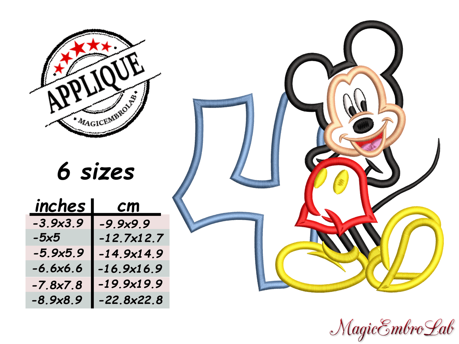 Mickey Mouse APPLIQUE Design, Fourth Birthday, 6 sizes, Instant Download