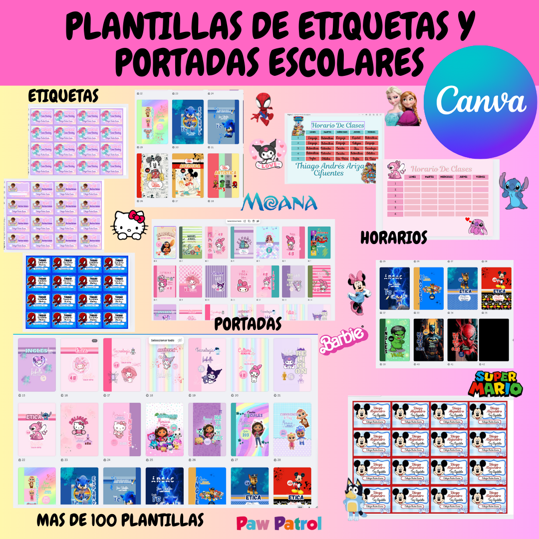 Pack de 41 diseños diferentes de portadas escolares, mas de 50 de etiquetas escolares, todas editables en Canva incluye como bono regalo unos kits de horarios escolares