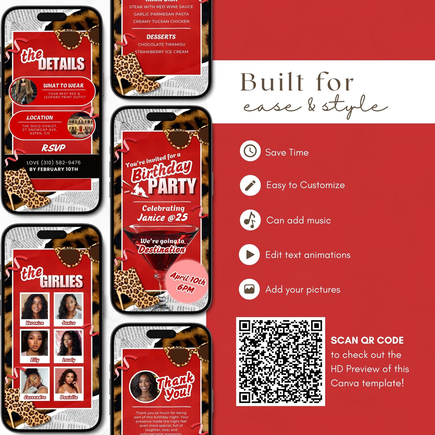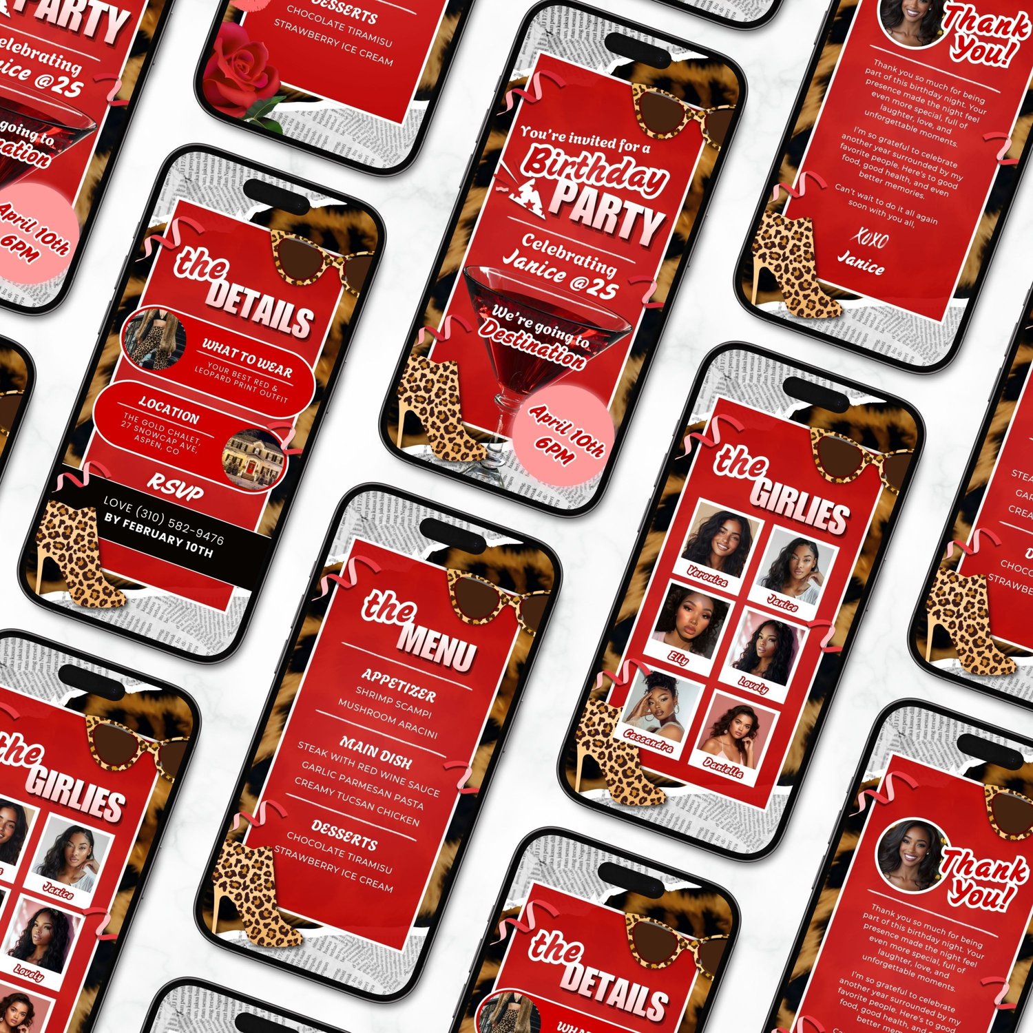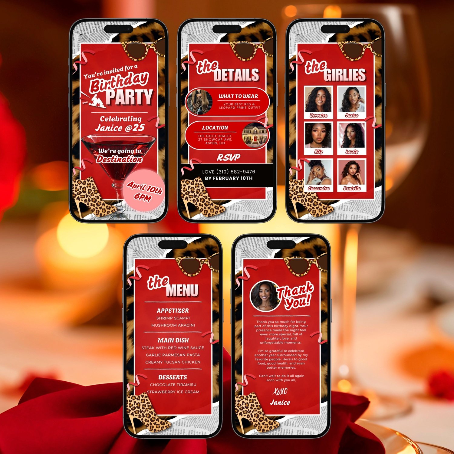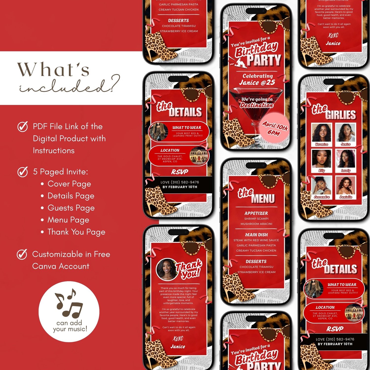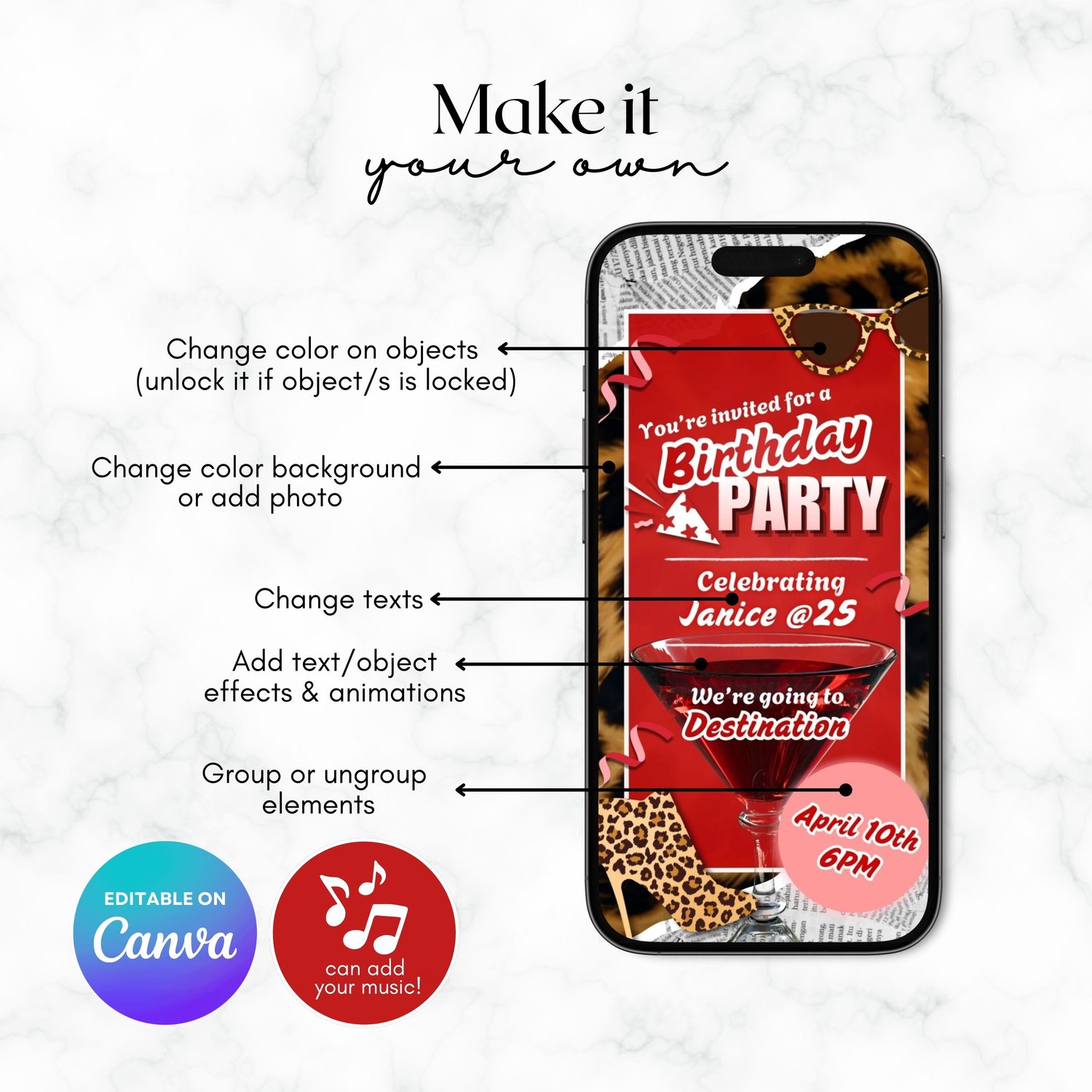 Birthday Party Invitation, Leopard Cheetah Cocktail Martini Theme Invite for Girls Night Bday Dinner (Modern Animated Canva Video Template)