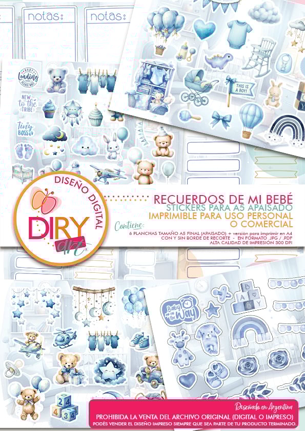 - 1 pack con stickers. Contiene 6 planchas llenas de stickers con ilustraciones, frases y palabritas referidas a los bebés. Ideal para agregar en tus álbumes, para que cada familia decore a su gusto, o para recortar y decorar tu álbum. Las planchas están presentadas en hoja A5 apaisada y dos páginas en hoja A4, para que elijas en qué tamaño de impresión te queda más cómodo. Las planchas tienen márgen izquierdo, pensadas para imprimir en simple faz.