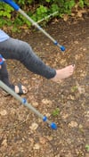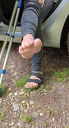 Lou macht einen Sonntagsspaziergang mit schwarzen Birkis und Krücken. Die Zehen sind, passend zu den Birkis, schwarz lackiert.