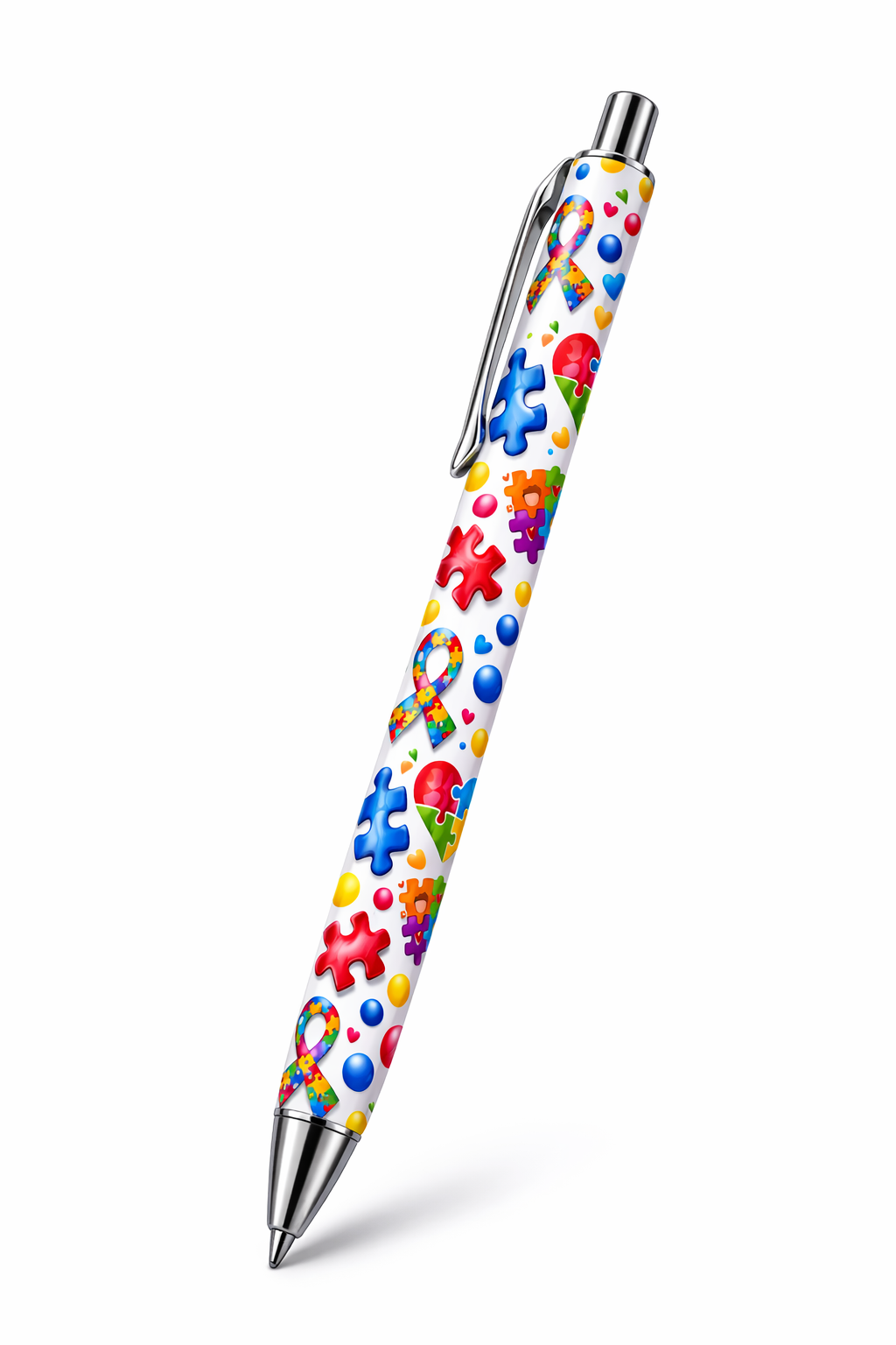 This vibrant design features colorful puzzle pieces, ribbons, hearts, and bright elements symbolizing autism awareness and support.
