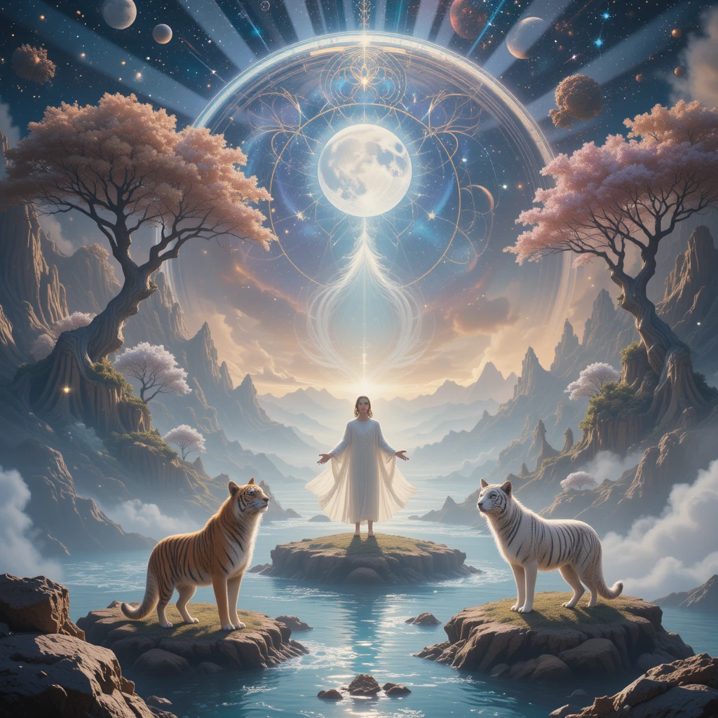 Tigers with translucent fur, wolves with stardust eyes, and humans etched with celestial markings live in radiant balance—each motion echoing throughout the space-time continuum and returning to its origin. Floating islands, spiral galaxies, and glowing rivers set the tone for a deeply philosophical visual experience.