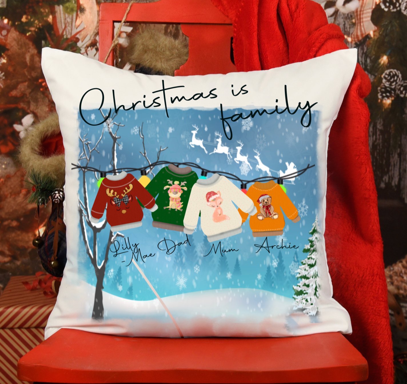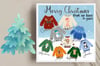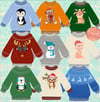 9 different hand painted jumpers, sweaters, each with their own Christmas character.