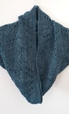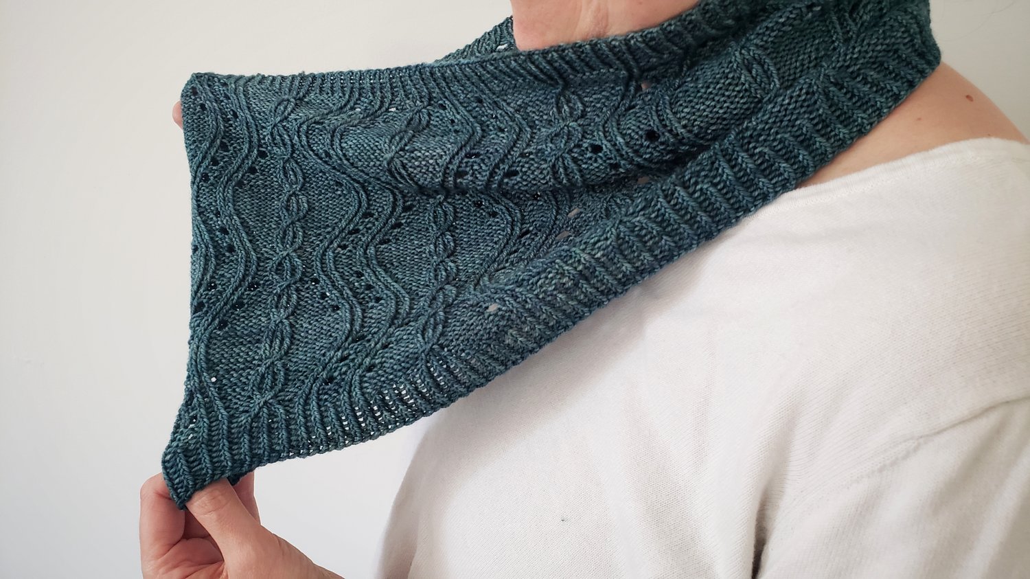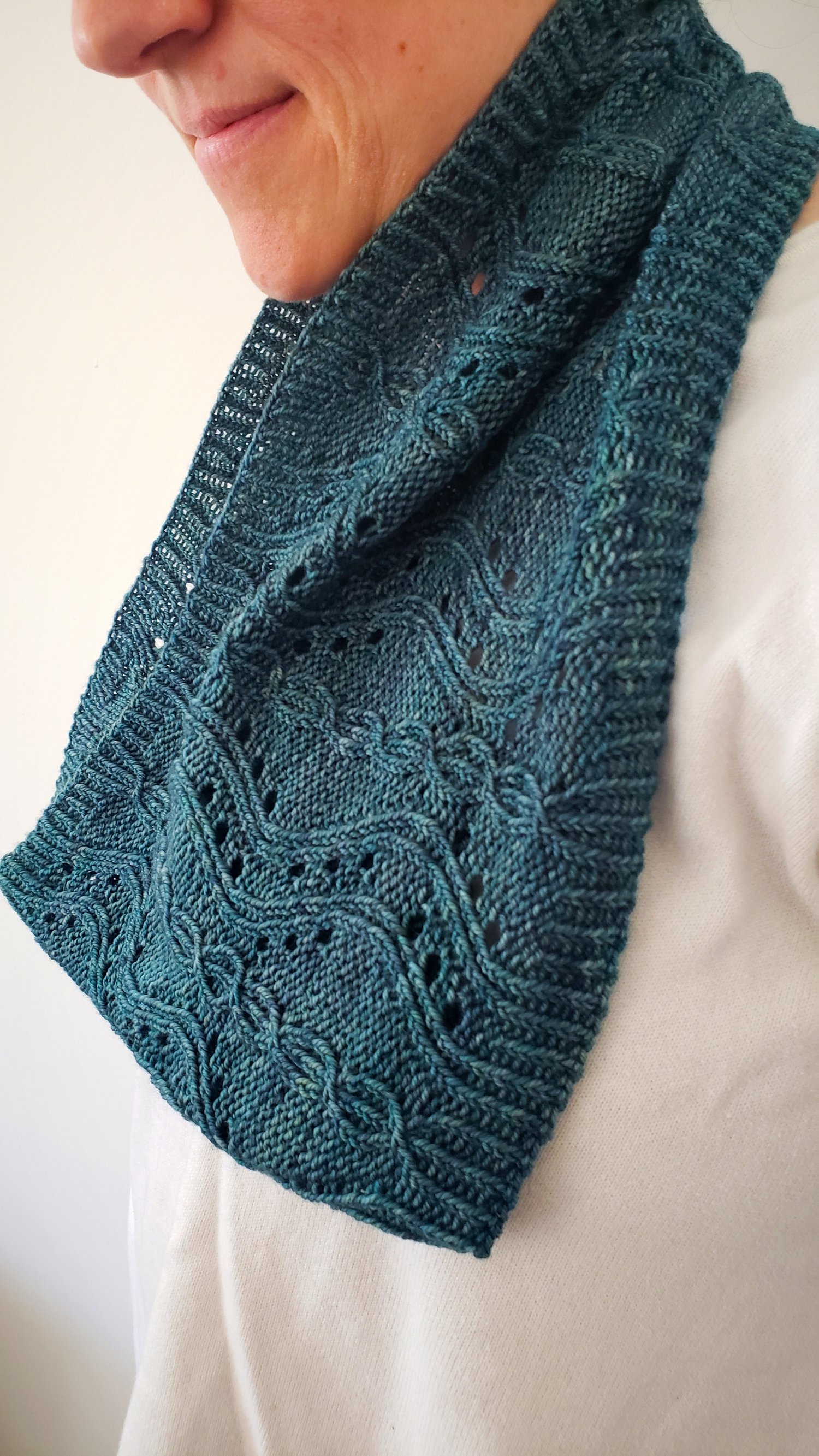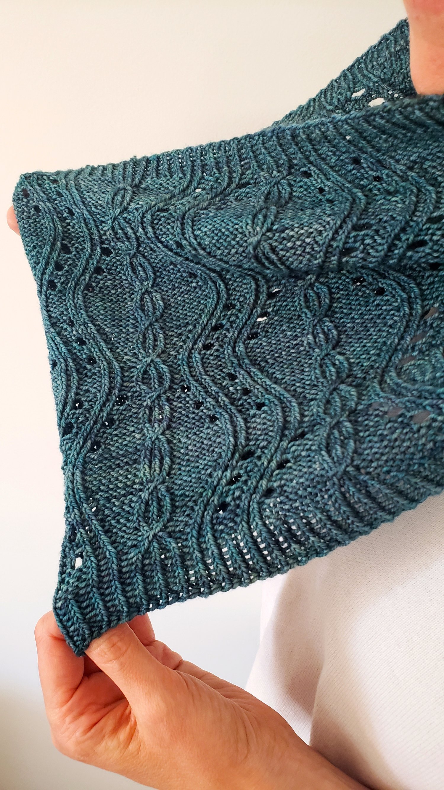 Sinusoid is a beautiful, lightweight little cowl. It combines cables and lace for a lovely wavy pattern that is an interesting but calming knit. It is knit in the round, with twisted rib borders on either end that flow into the pattern. The size is easily customized to your preference. Knit in fingering weight yarn, it is light and flowing, and lets you use those beautiful variegated single skeins hiding in your stash.