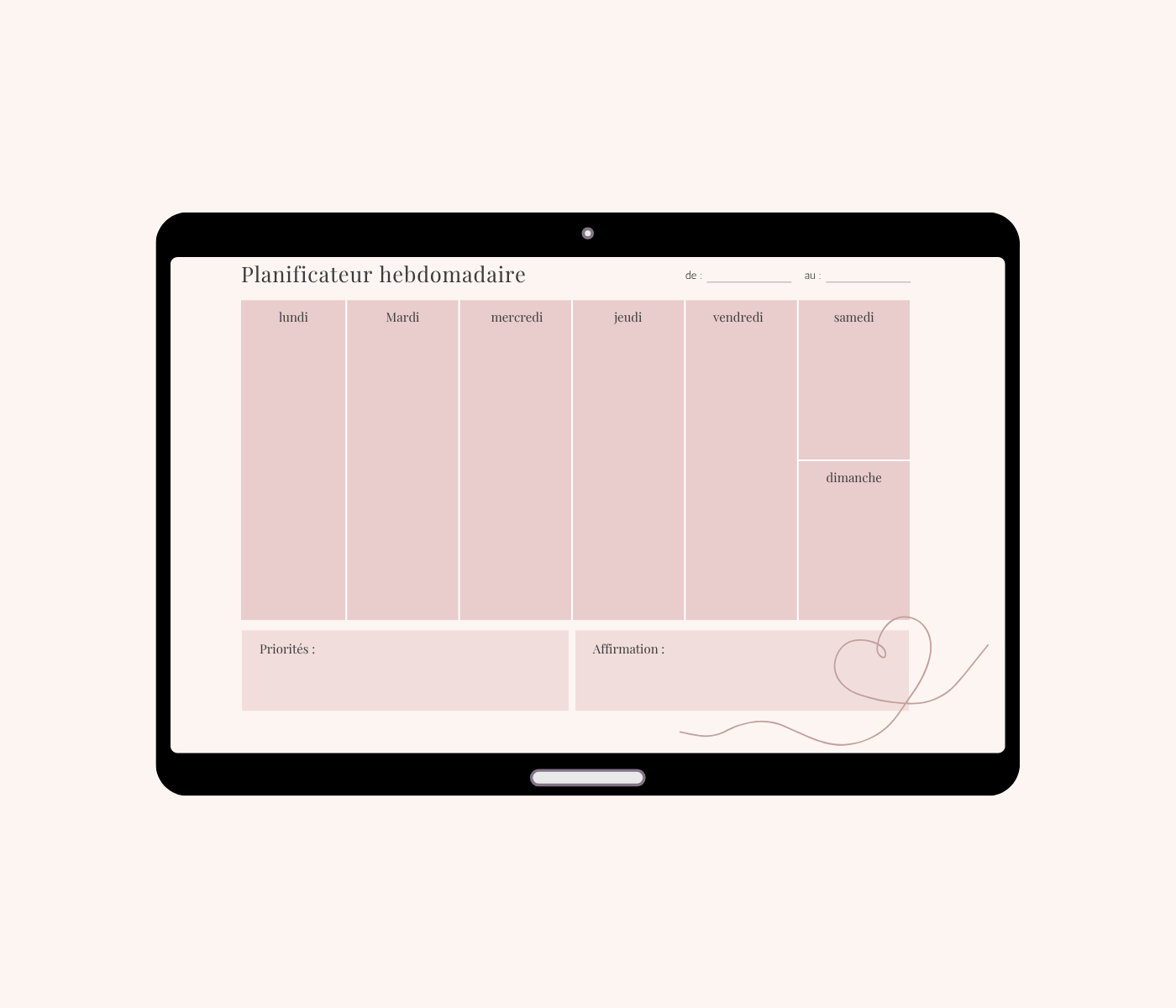 Ce planificateur hebdomadaire minimaliste est parfait pour celles qui aiment les choses simples, nettes, efficaces. Il t’aide à garder le cap sur tes rendez-vous, priorités et tâches sans t’encombrer. Un seul coup d’œil suffit pour t’organiser avec plus de fluidité chaque jour.