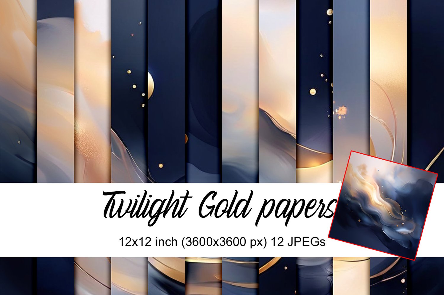 Keywords: Twilight Gold Digital Paper, Luxury Scrapbook Backgrounds, Navy Blue and Gold Wallpaper, Junk Journal Papers, High-Resolution Digital Asset, Elegant Social Media Backgrounds, 12x12 Digital Scrapbook.