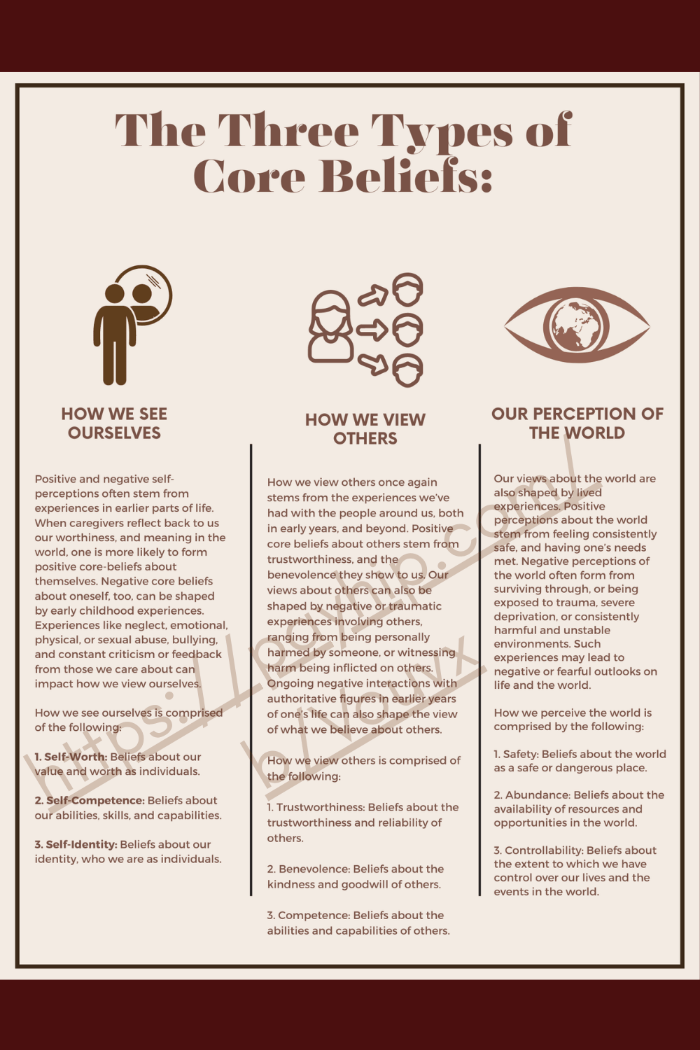Core beliefs can fall into one of three categories: how we see ourselves, how we see others, and how we perceive the world around us. This worksheet gives an overview of how negative and positive core beliefs can form in each category. Awareness about the foundation of one's core beliefs can be an important starting point in help reshaping them, and transitioning negative core beliefs into ones that may be more adaptive to an individual's adult self.