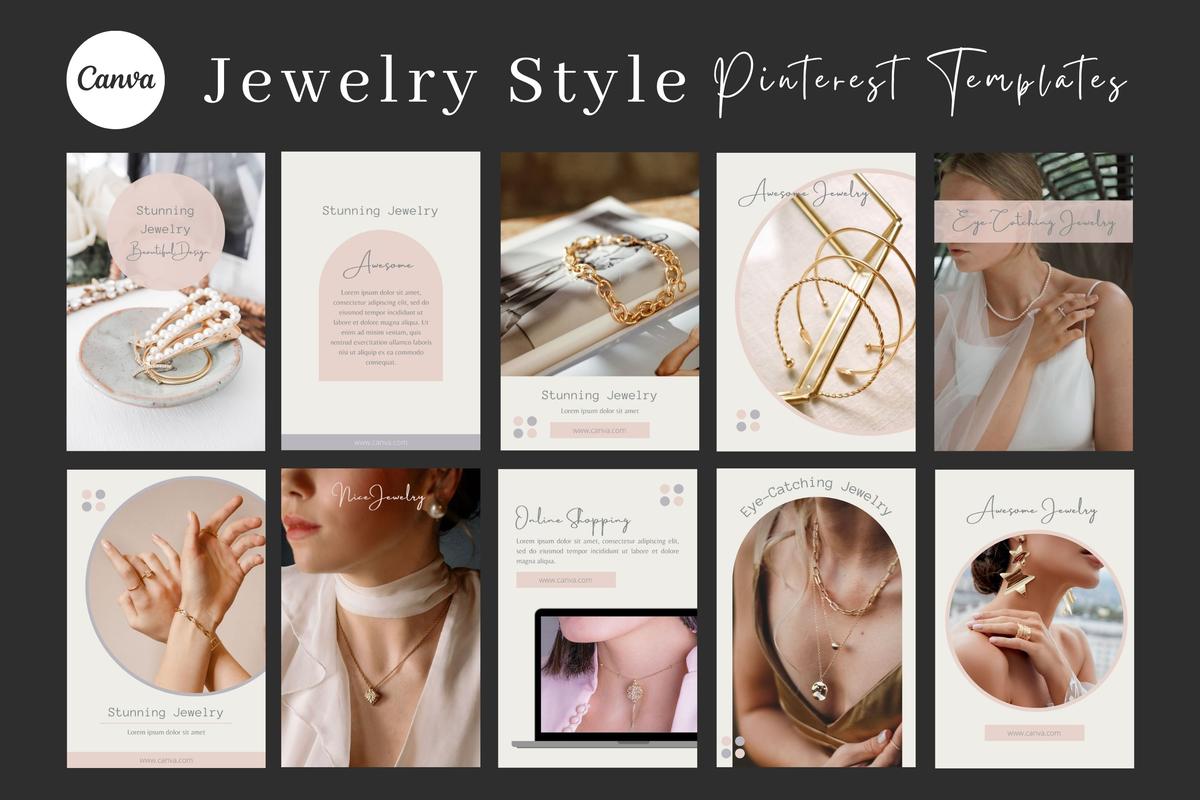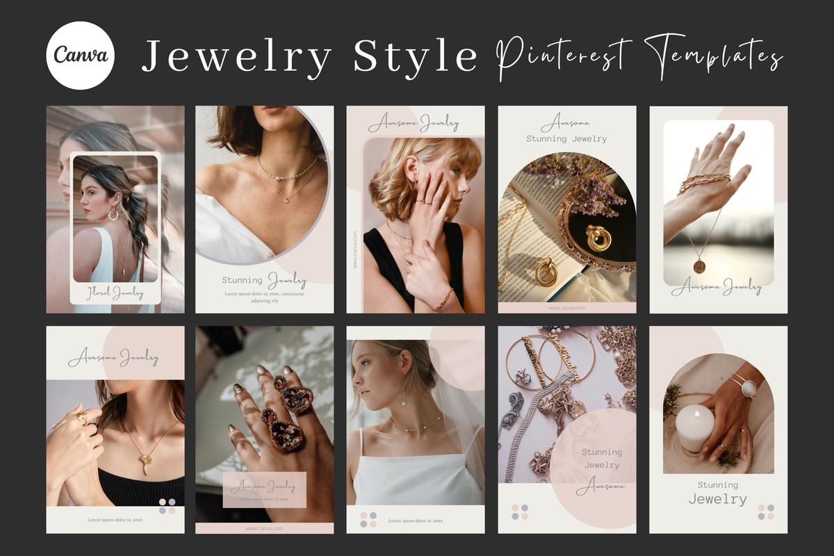 60 Canva Pinterest Creative Social Media Kit contains Jewelry, Food, and Product template Designs.
