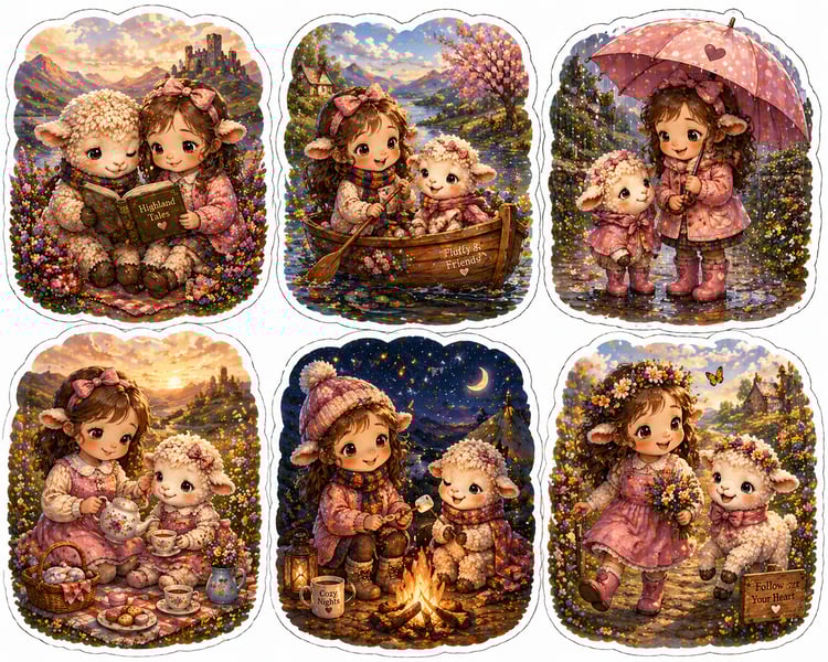 Fluffy & Friends โ Cozy Highland Adventures Sticker Pack ๐๐ - ๐ธ Whatโs included: 6 high-quality PNG stickers Transparent backgrounds Large, detailed illustrations (perfect for print & digital use)