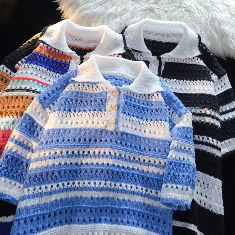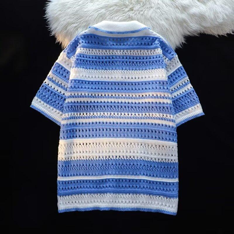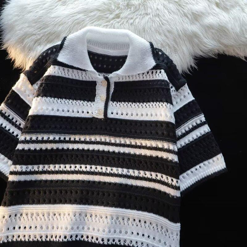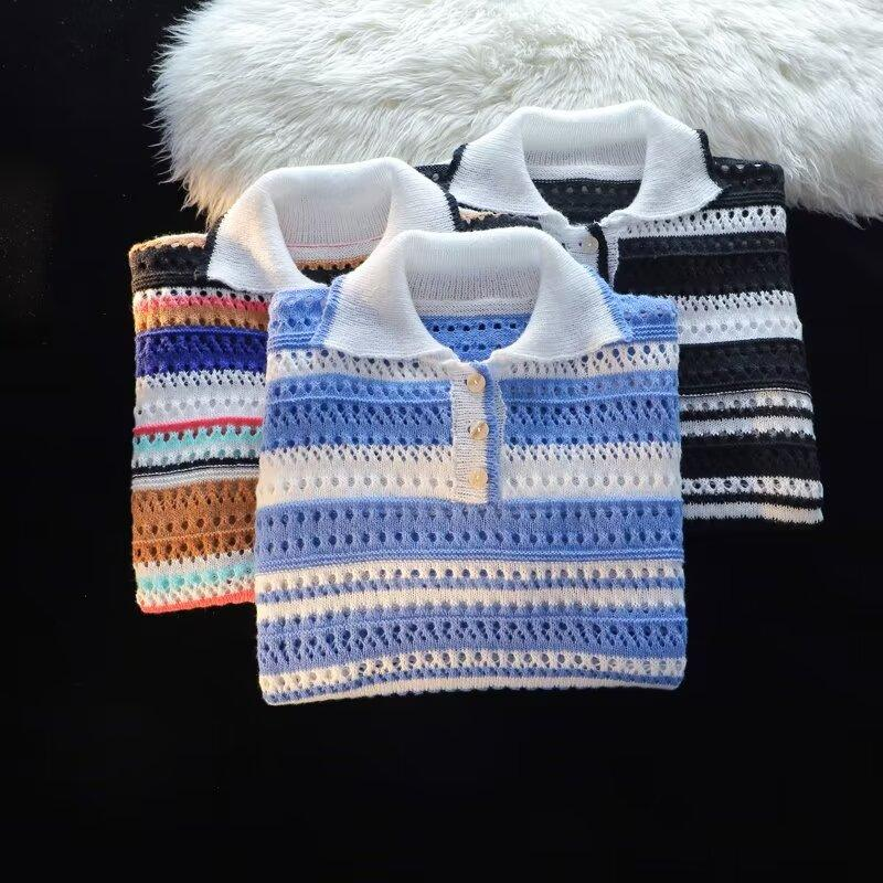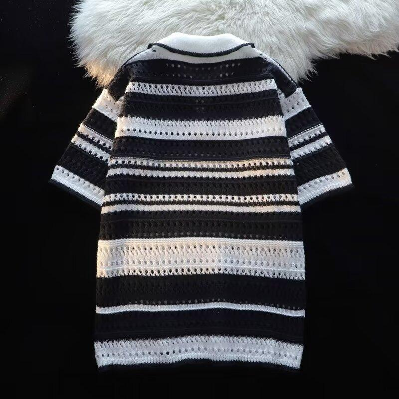 Couple Polo Shirt, Knitted, Sleeveless, Lapel, Striped Design, Short Sleeves