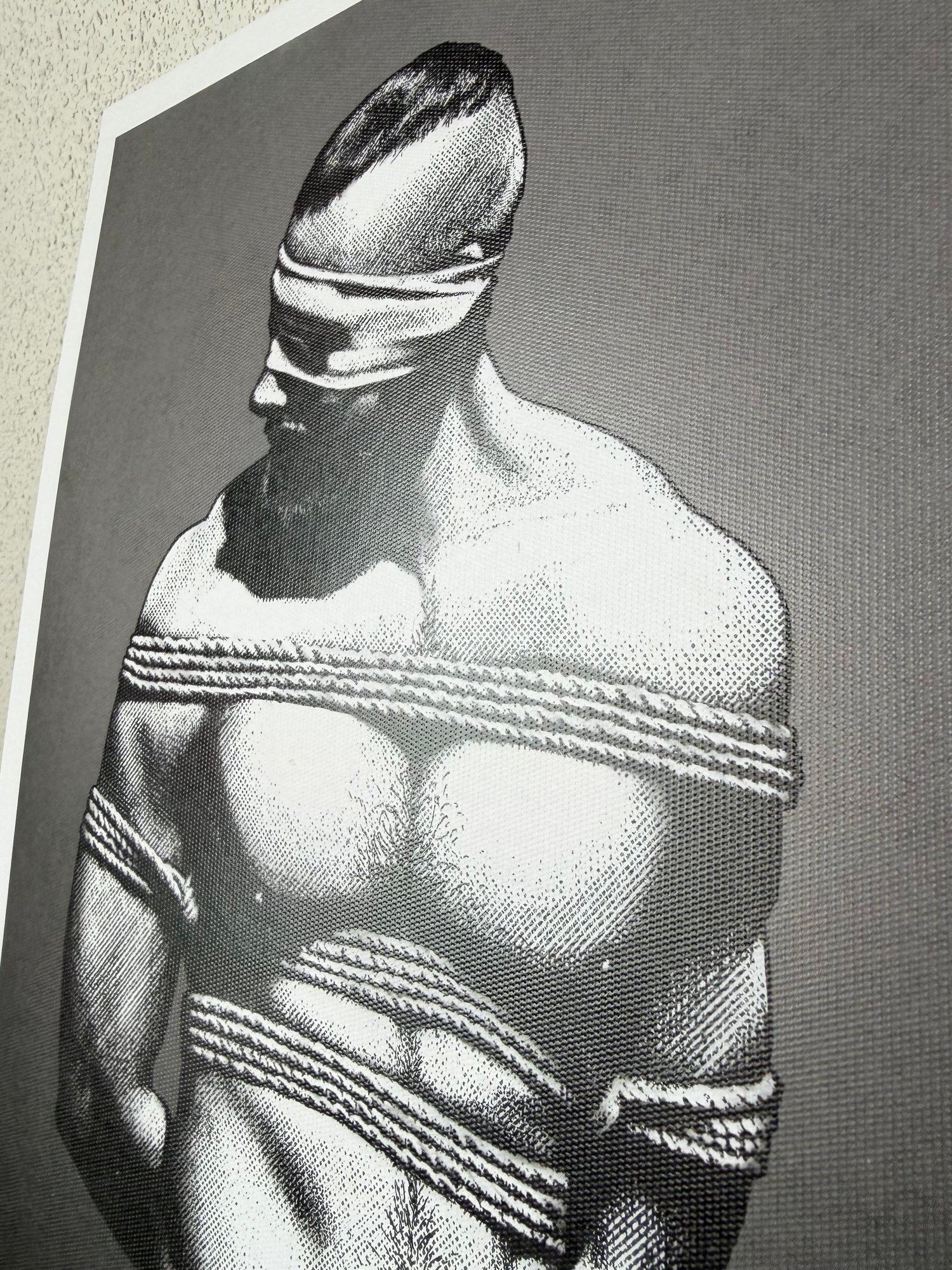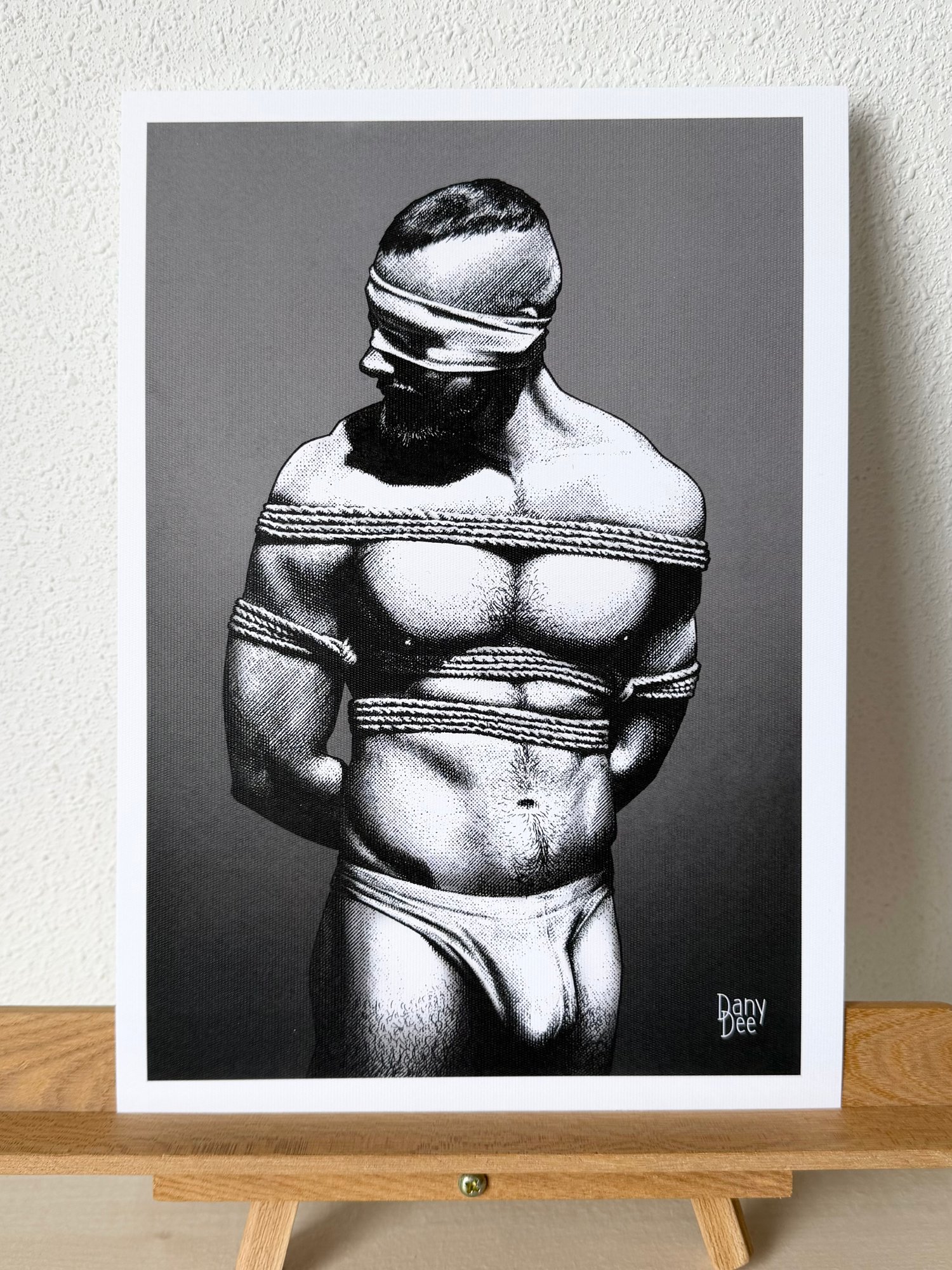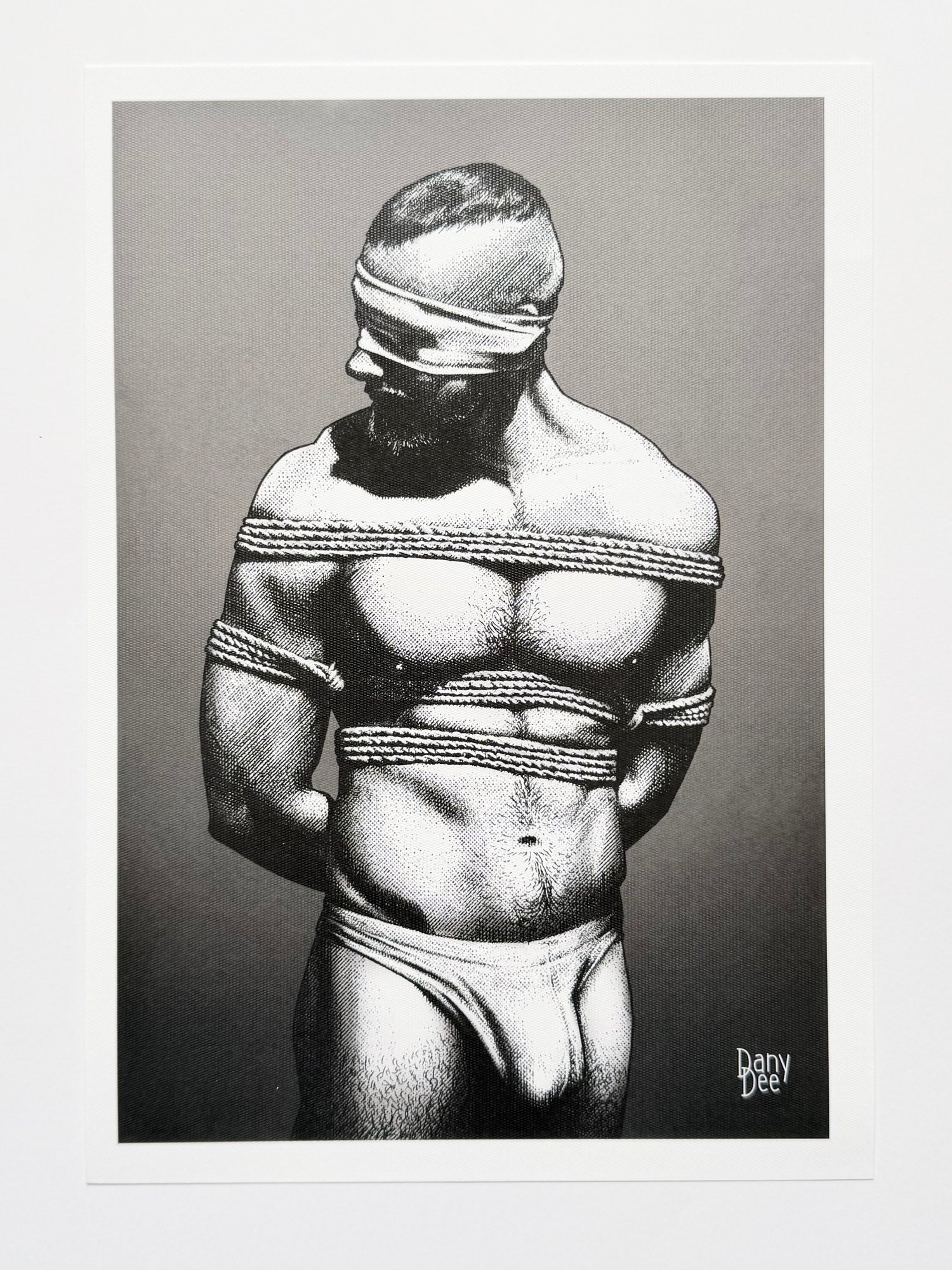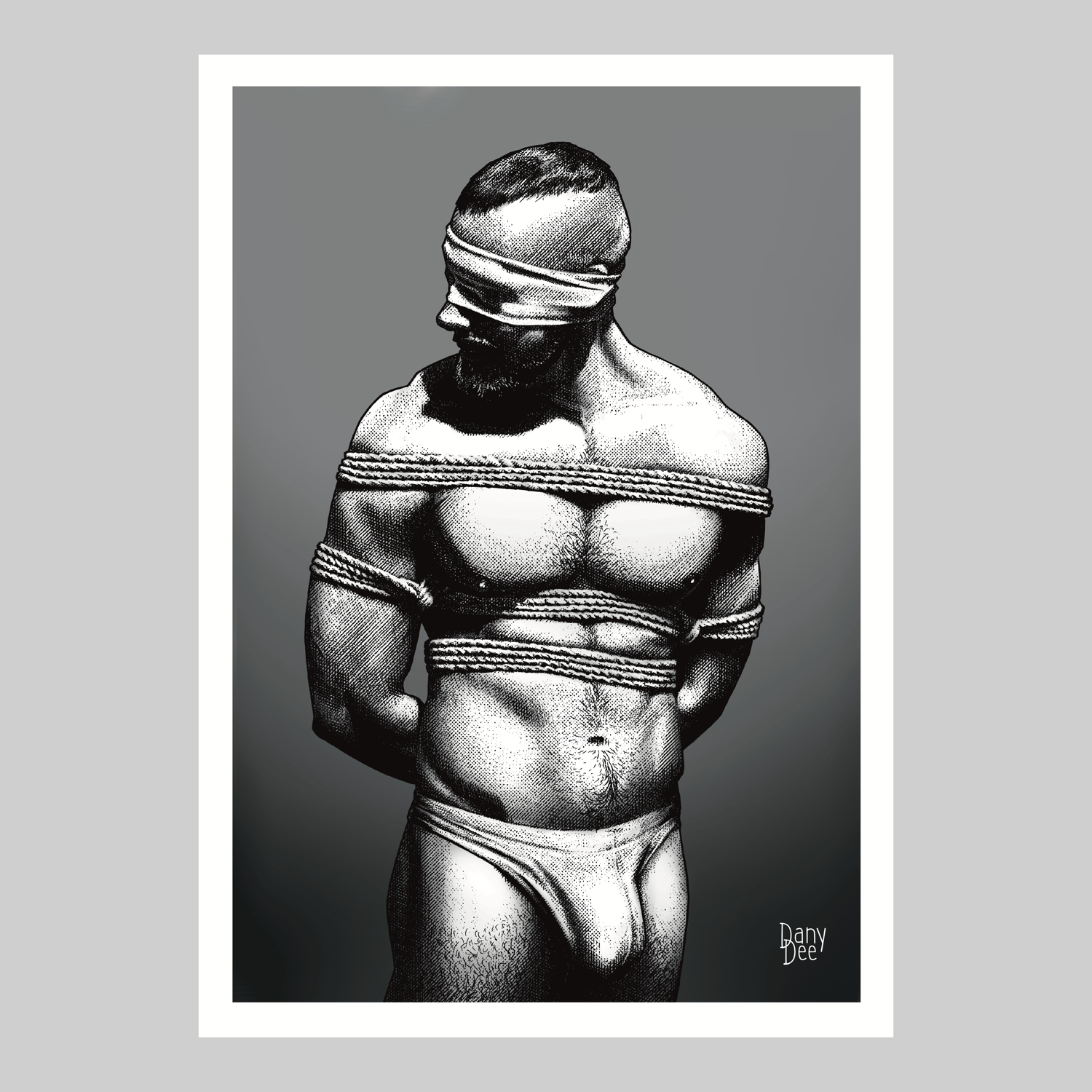 "The Rope No. 3" is a hand-drawn, monochromatic A4 art print celebrating shibari bondage culture — a bold homoerotic illustration of a massively built bearded man standing still in thick rope bondage with a latex blindfold, perfect for gay bondage art collectors or queer home decor.