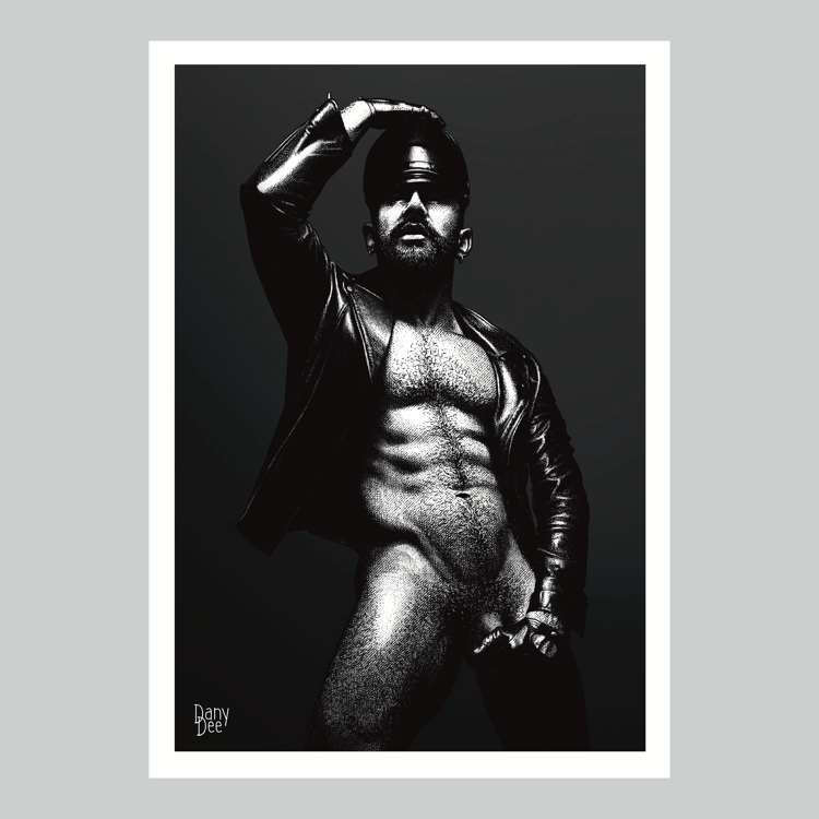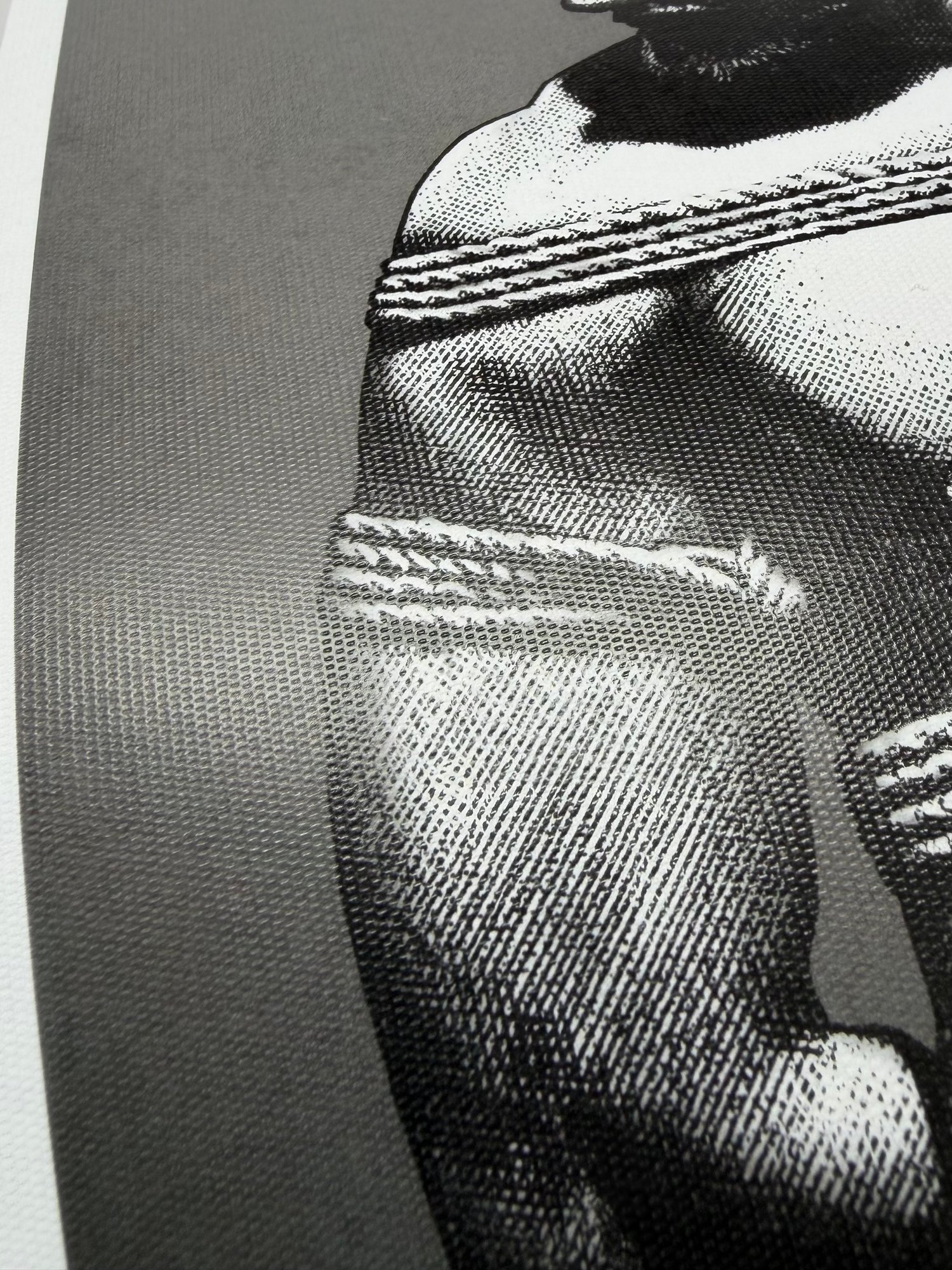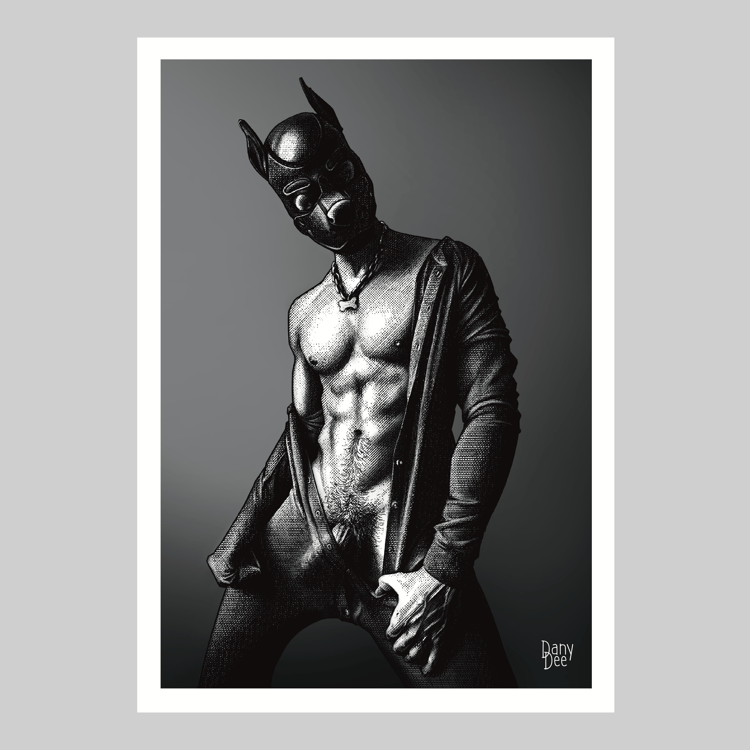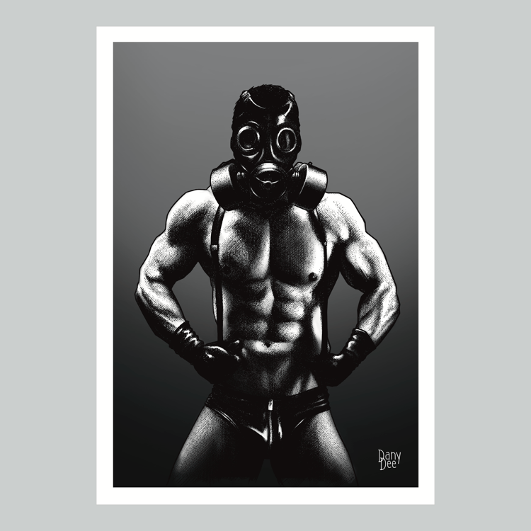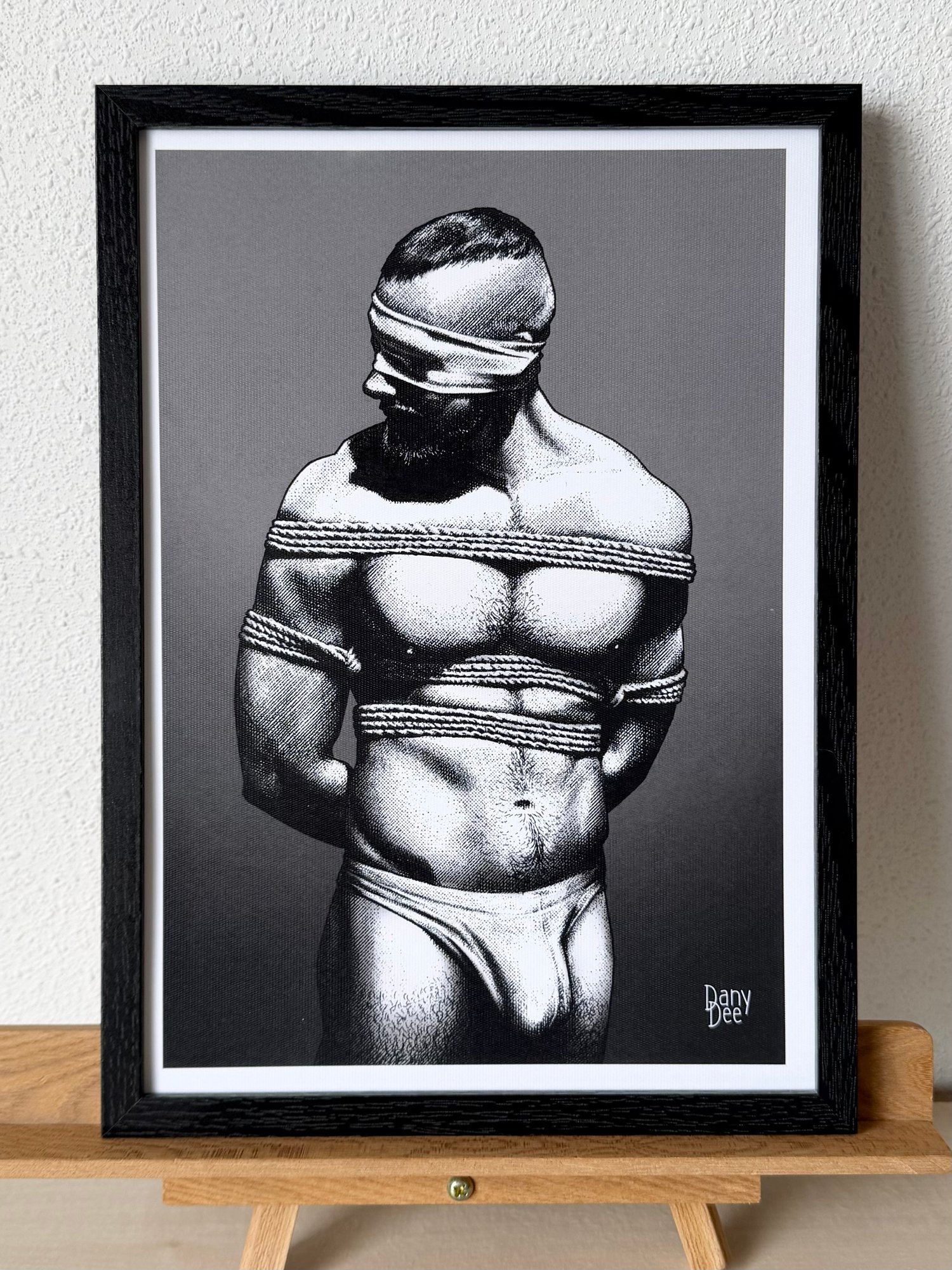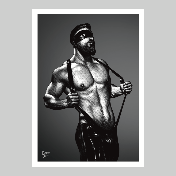 "The Rope No. 3" is a hand-drawn, monochromatic A4 art print celebrating shibari bondage culture — a bold homoerotic illustration of a massively built bearded man standing still in thick rope bondage with a latex blindfold, perfect for gay bondage art collectors or queer home decor.