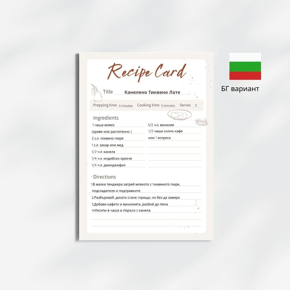 Изтегли 3 лесни и уютни есенни рецепти, оформени като принтируеми карти на английски и български език. Подходящи за заети родители, семейства или всеки, който обича сезонния уют. Можеш да ги принтираш, да ги добавиш в кулинарен тефтер или да ги използваш като вдъхновение за семейни готварски моменти.