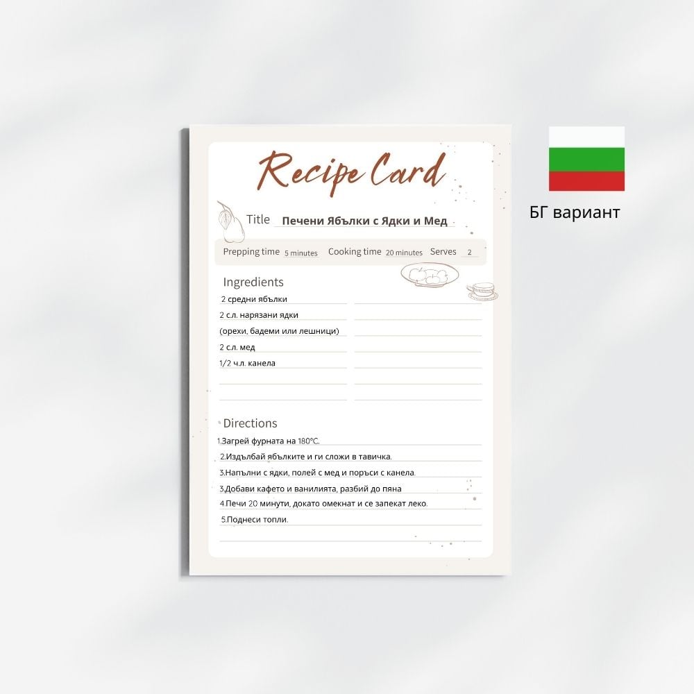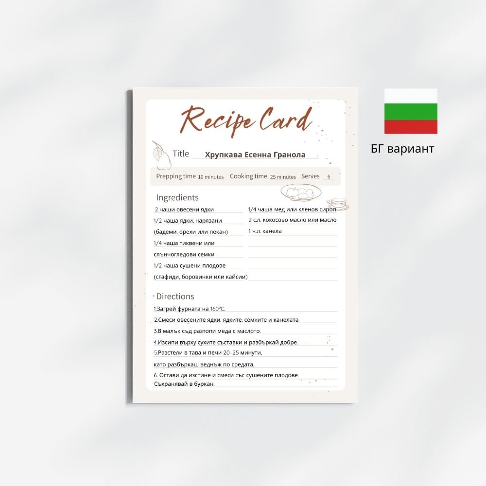 Download 3 easy and cosy autumn recipes, designed as printable recipe cards in both English and Bulgarian. Perfect for busy parents, families, or anyone who loves seasonal comfort. Print, keep in your recipe binder, or use as inspiration for family cooking moments.