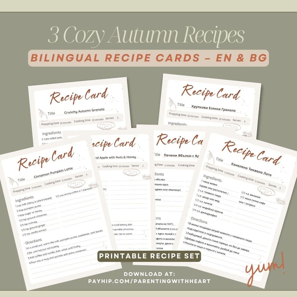 3 Cozy Autumn Recipes – Bilingual Printable Recipe Cards (EN & BG) 3 уютни есенни рецепти – двуезични принтируеми карти (EN & BG)