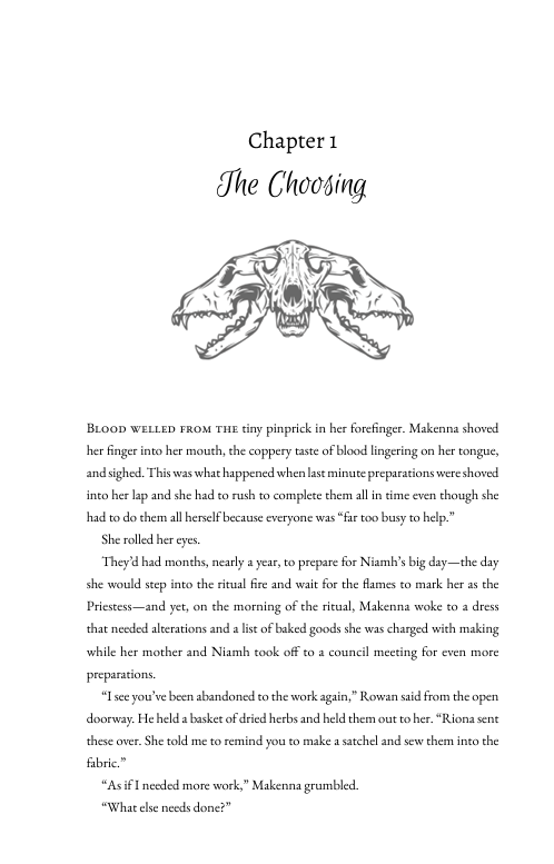 Makenna has never belonged. As a fire witch born in a village of healer and blamed for every fire-related incident even if she wasn't at fault, she has always lived on the outside looking in. When Makenna's sister, Niamh, is horribly burned during a ritual, Makenna is chased into the lifeless woods of Witches End. But the woods are not empty. A plea turns into a bargain and Makenna pledges her nights to a shapeshifter named Fen. But Fen has many secrets and Makenna is plunged into the mystery of the Morrigan and the spell performed hundreds of years ago to seal away a terrible foe. All secrets have a price and Makenna just might pay with her life.