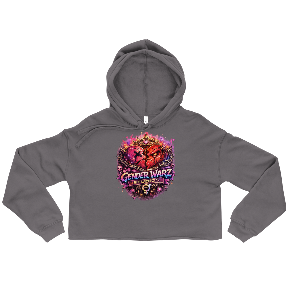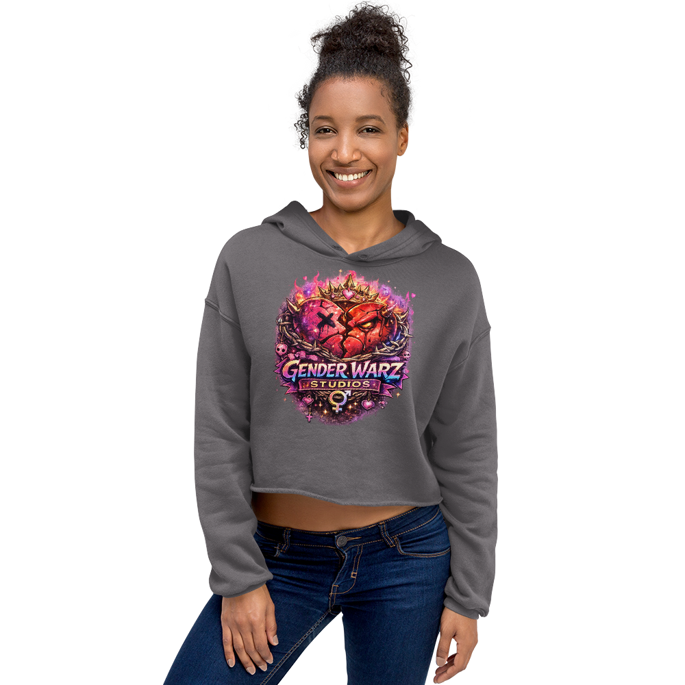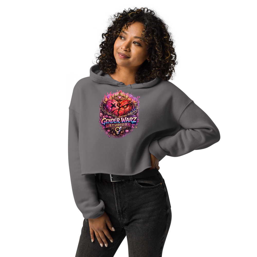 The Gender Warz Studios Women’s Crop Hoodie is a bold expression of femininity, strength, and emotional power. Featuring a vibrant broken-heart emblem crowned with fire and feminine symbols, this design represents love endured, lessons learned, and confidence reborn.