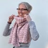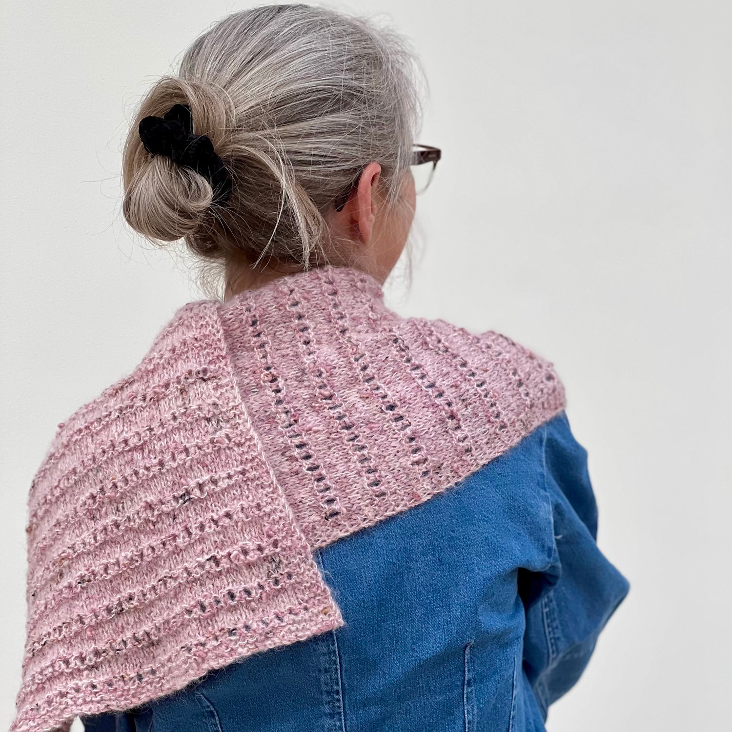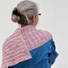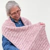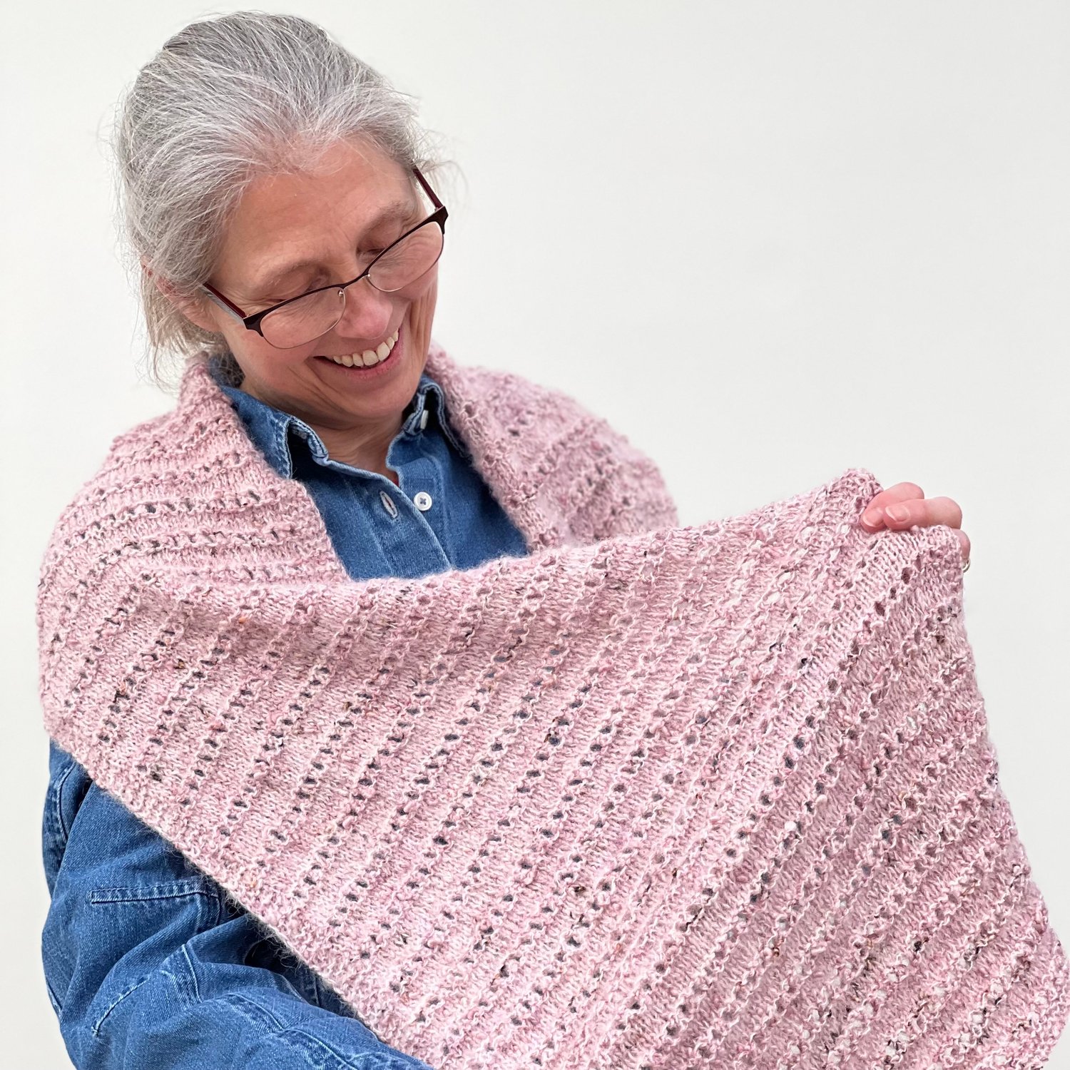 Large size shawl is shown in pink: yarn A shade Chantilly and yarn B shade Second Hand Rose.