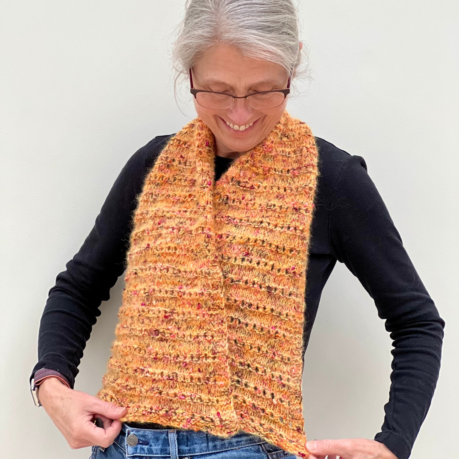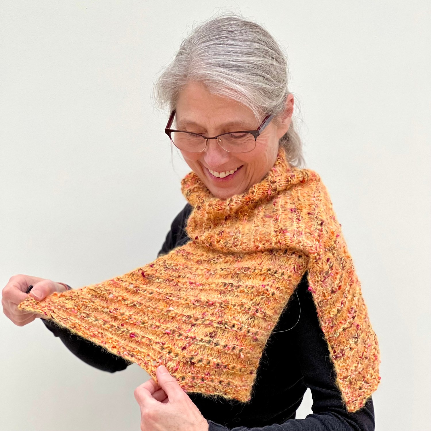 Small size shawl is shown in yellow: yarn A shade Pumpkin Everything and yarn B shade Sweater Season.