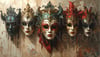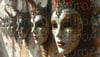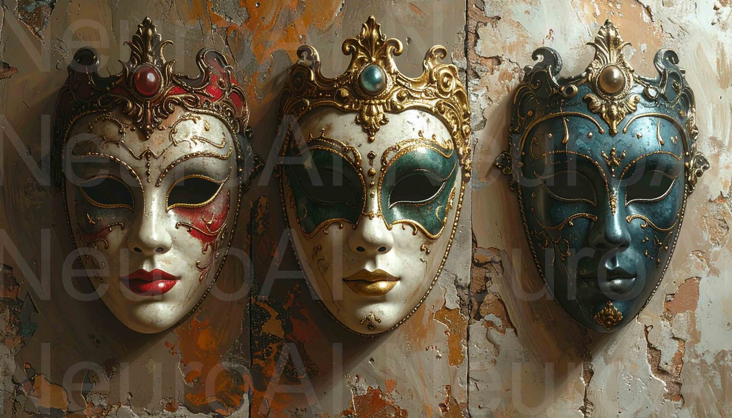 Elegant Venetian masks on textured wall, mystery, intrigue