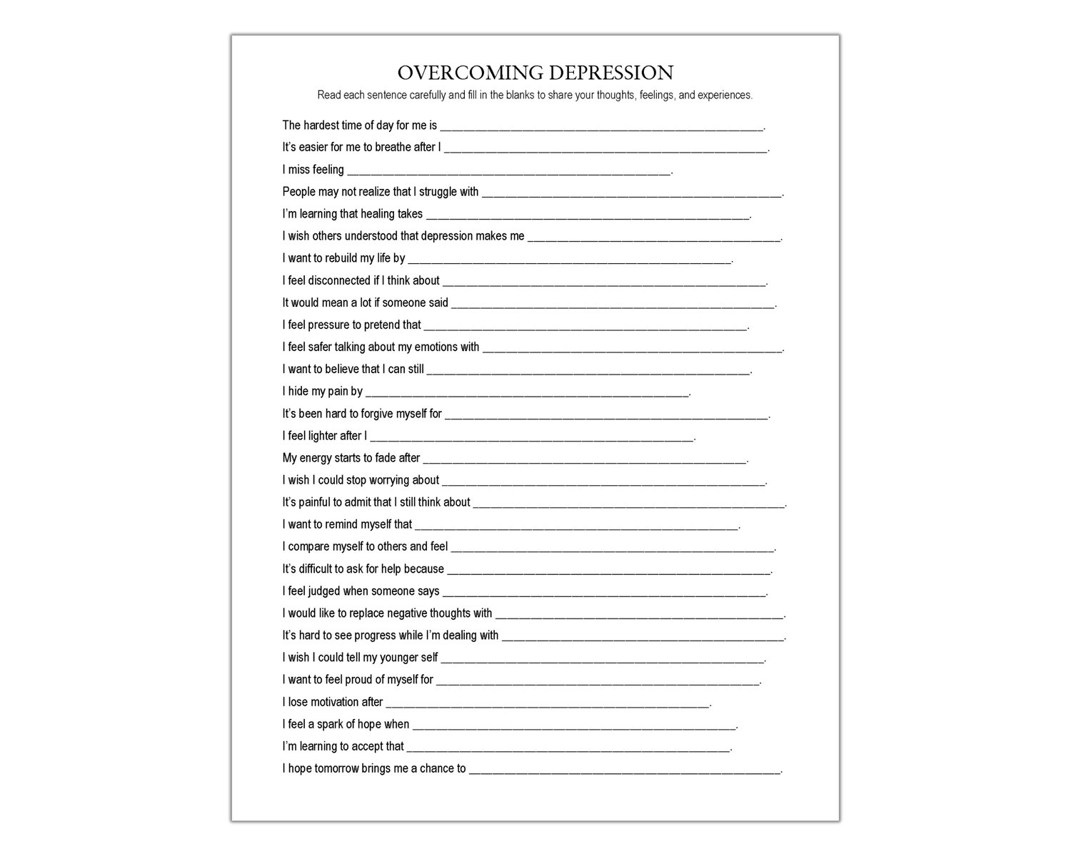 Feeling stuck or overwhelmed? This Overcoming Depression worksheet features 30 prompts to help you explore your feelings and challenge negative thoughts. Use it for therapy, journaling, or self-care routine to take small, meaningful steps toward feeling steadier and more grounded.