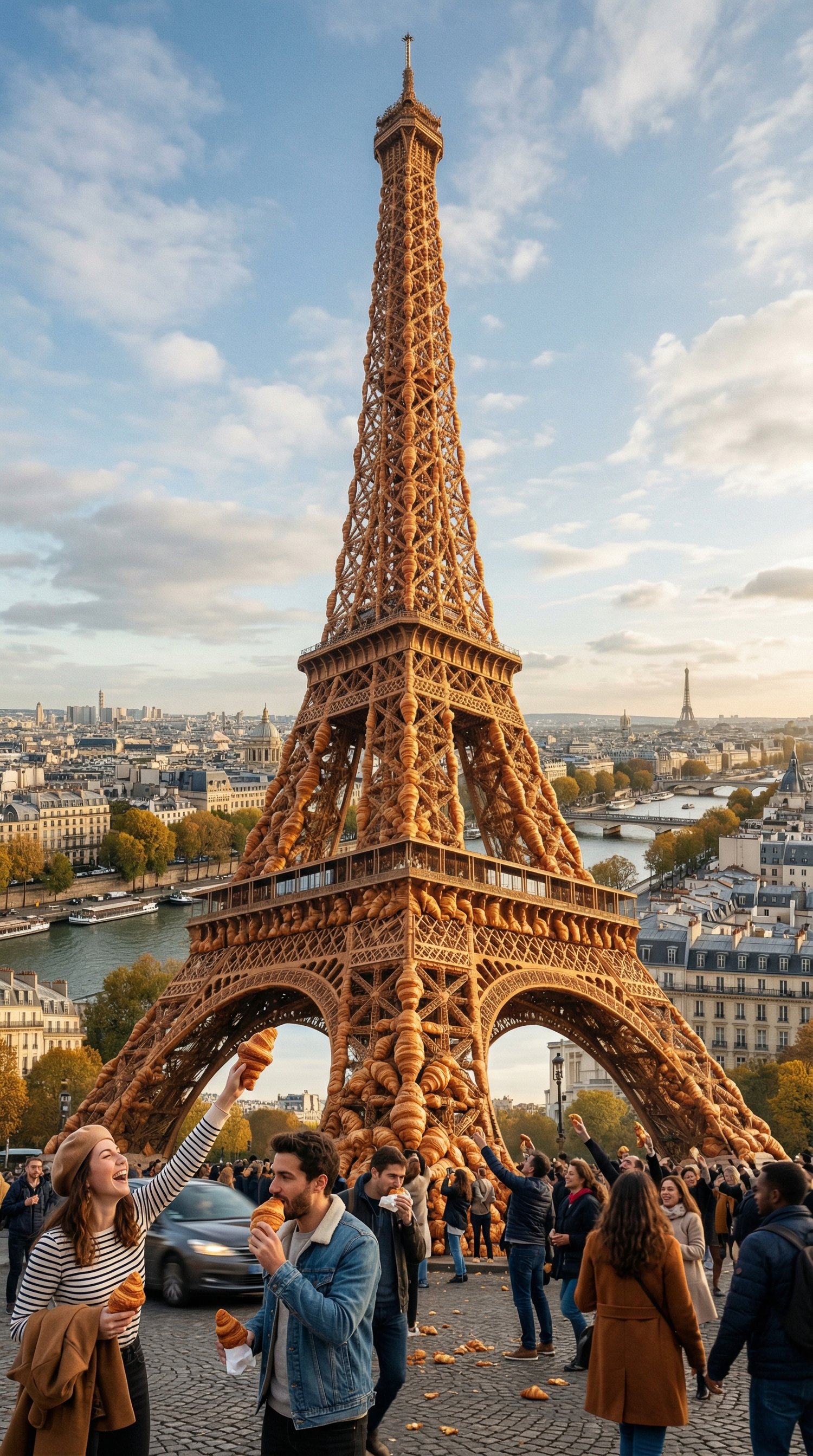 A playful, photorealistic digital artwork depicting the Eiffel Tower entirely built from detailed, realistic croissants. People in the foreground eagerly grab treats, while a hyper-realistic Paris cityscape glows under cinematic lighting. Perfect for high-resolution prints, fun social media posts, or whimsical digital projects — clean, watermark-free file included.