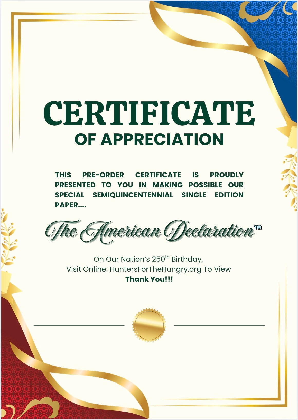 We sincerely thank you for your support and for joining us in celebrating America’s Semiquincentennial. Your copy will be viewable upon release, on July 4th, 2026 by going to: HuntersForTheHungry.org