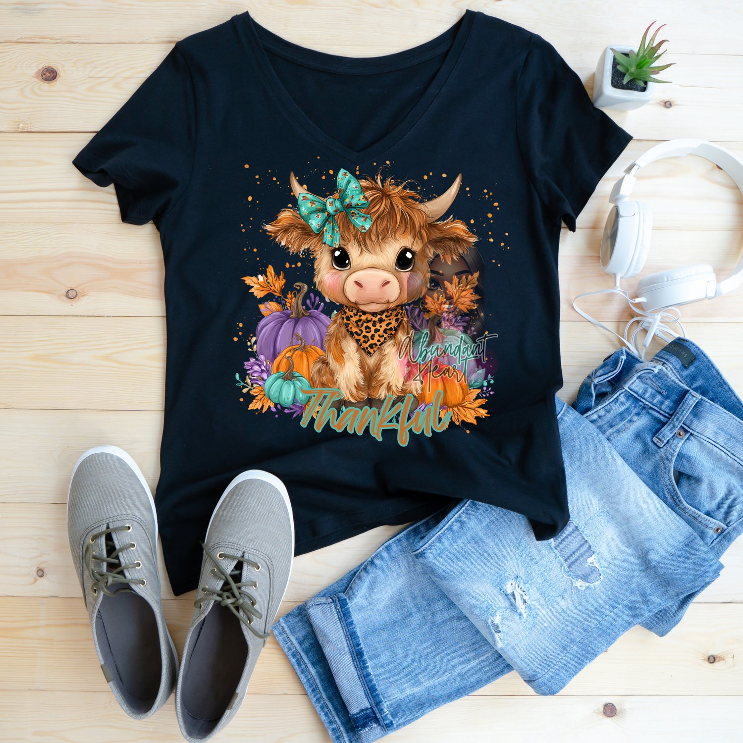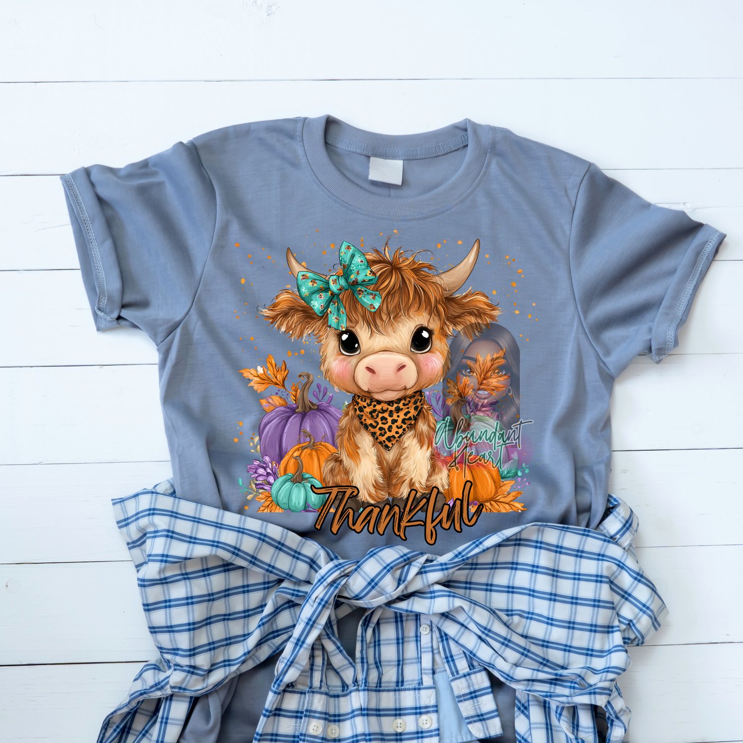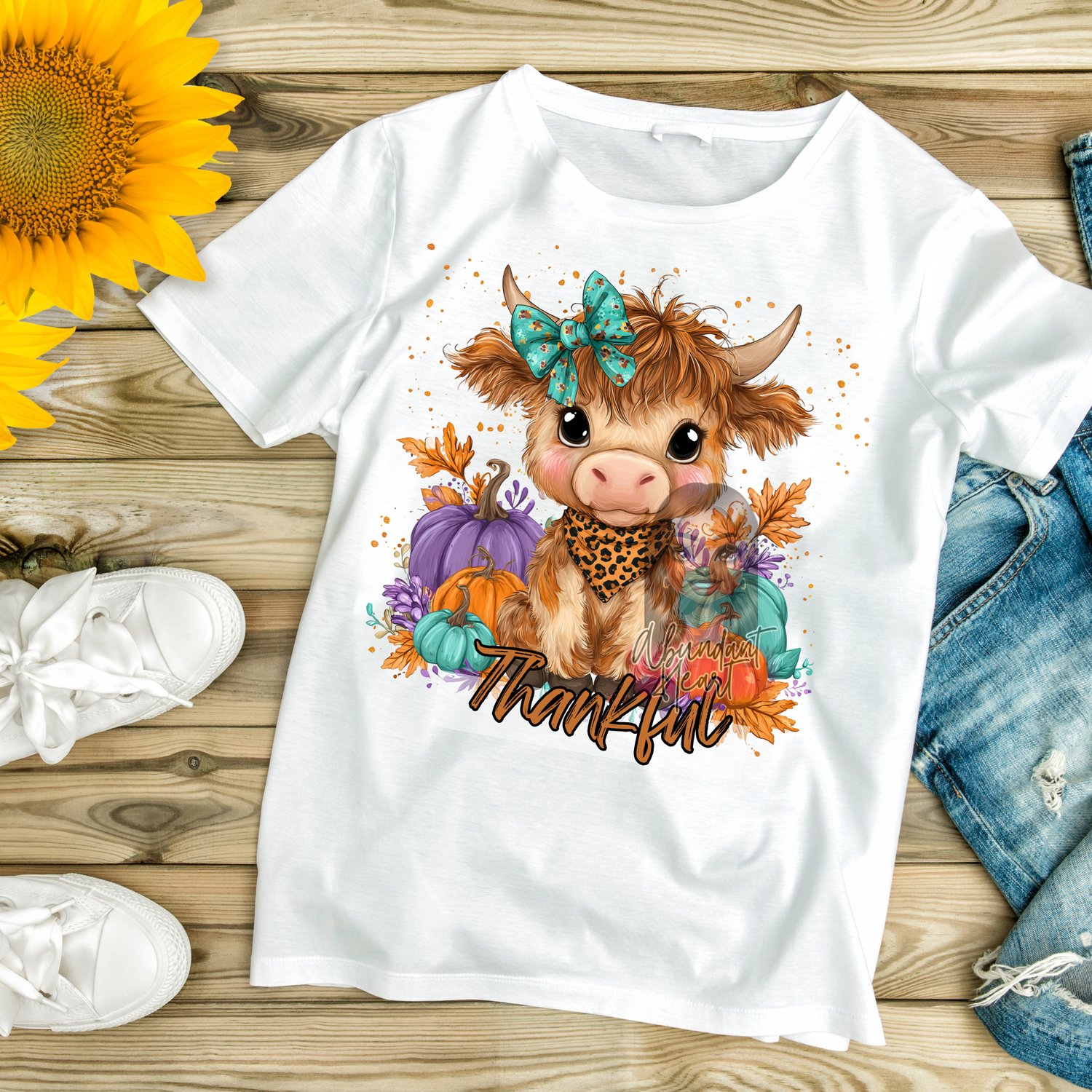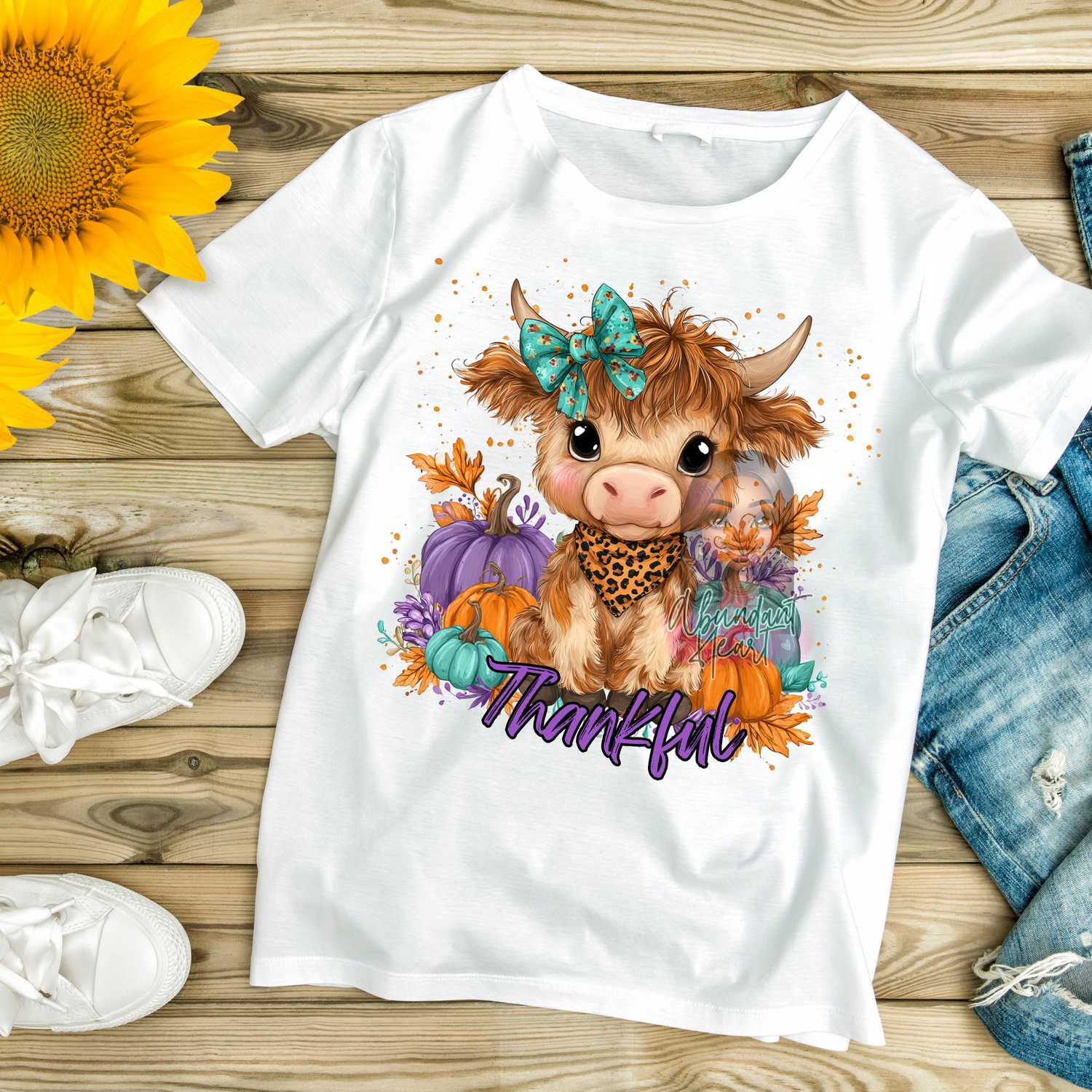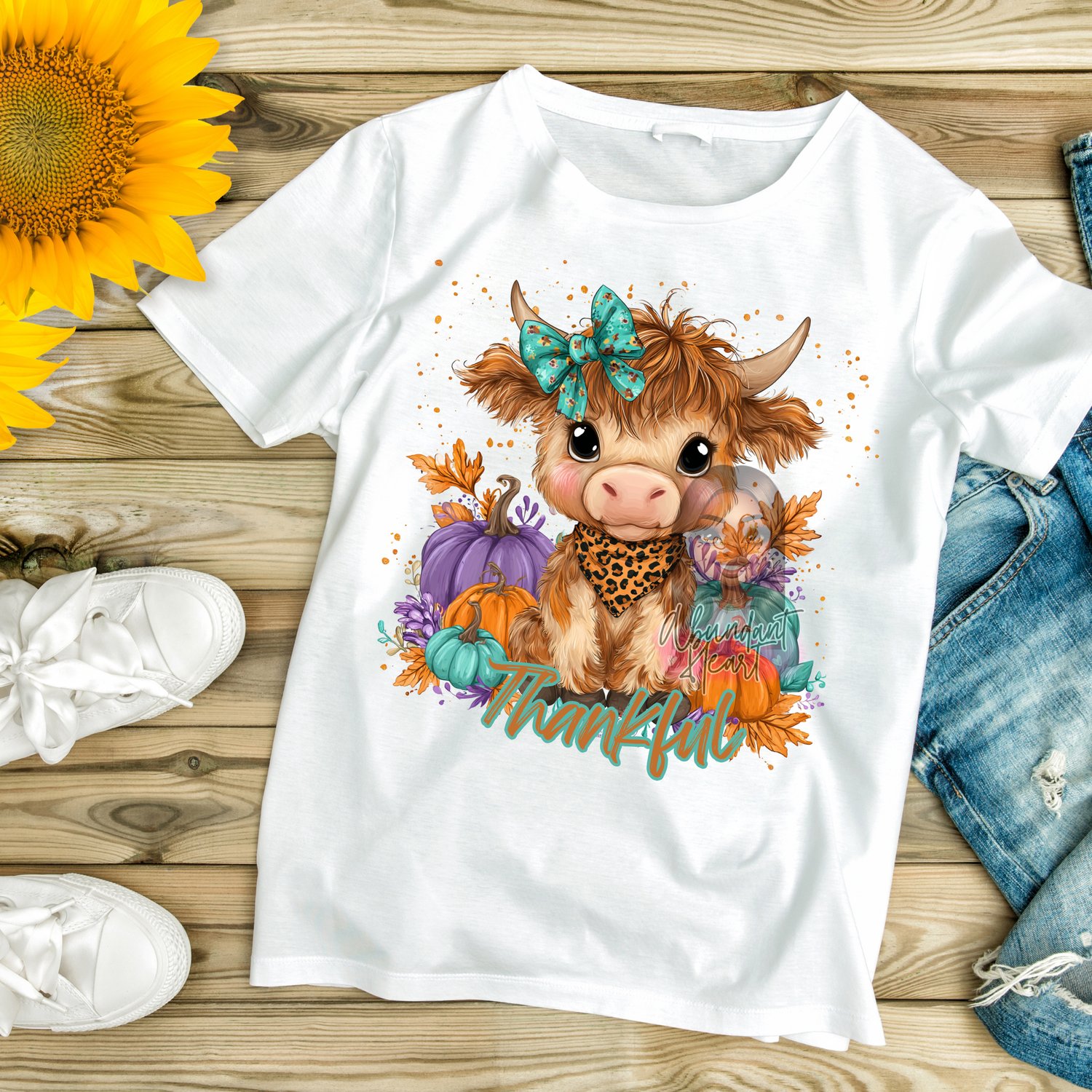 Celebrate the season with this adorable Highland cow PNG design! Featuring a fluffy highland calf with big, sparkling eyes, a teal bow, and a leopard print bandana, this artwork is surrounded by colorful pumpkins, fall leaves, and the word Thankful in bold script.