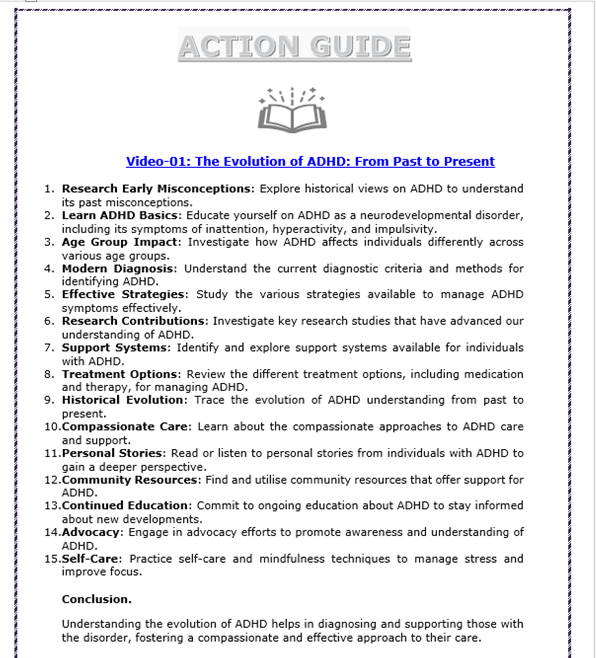 Our meticulously curated collection of 100 high-definition, (cinematic-style) video shorts is designed to empower parents in nurturing their ADHD child's potential. These engaging videos, complemented by comprehensive Checklists and an Action Guide Workbook, provide families with tangible solutions for establishing routines, enhancing focus, and promoting emotional well-being.