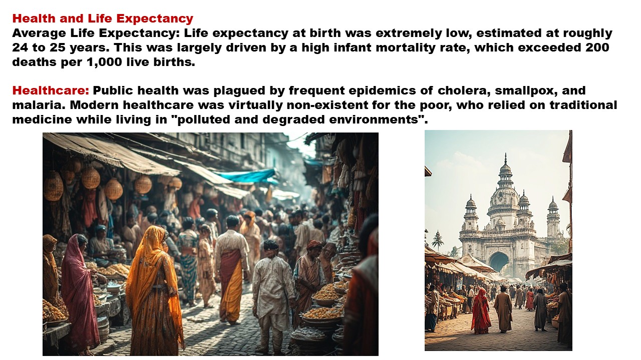 Healthcare: Public health was plagued by frequent epidemics of cholera, smallpox, and malaria. Modern healthcare was virtually non-existent for the poor, who relied on traditional medicine while living in "polluted and degraded environments".Â