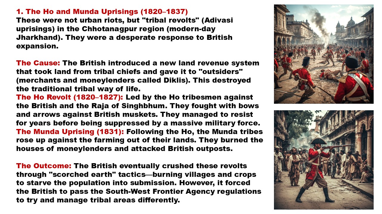 Resistance: While the famous Sepoy Mutiny occurred later (1857), this era saw numerous smaller uprisings, such as the Ho and Munda revolts (1820–1837) and the Satara disturbances (1840).